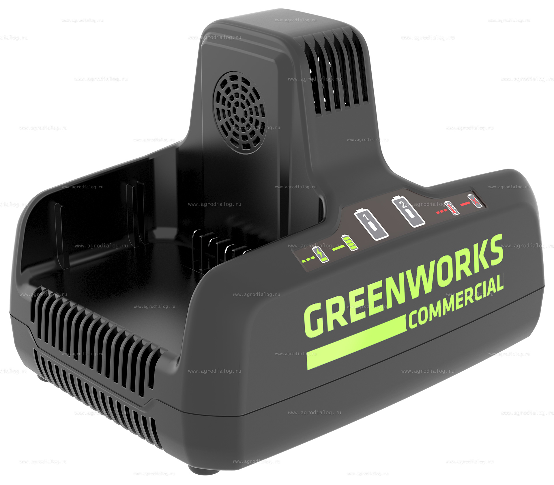 Зарядное устройство на 2 слота Greenworks G82C2 82V применяется для ускоренной зарядки двух аккумуляторов напряжением 82 вольт одновременно и емкостью 2.5 А/ч, 5 А/ч, 8 А/ч.