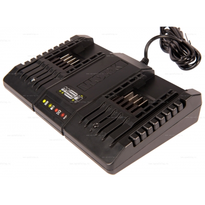 Двойное зарядное устройство Worx WA3869 для простой зарядки литий-ионных аккумуляторов. Данная модель обладает индикатором уровня заряда и системой защиты от перезаряда аккумулятора. При достижении 100% заряда питание автоматически отключается. Устройство снабжено перфорацией для защиты от перегрева и прорезиненными ножками для устойчивости на плоскости. Предусмотрены проушины для крепления на стену. Выходное напряжение: 20 В. Ток зарядки: 2 А. Номинальная потребляемая мощность: 50 Вт. Вес: 0,5 кг.