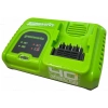 Двойное зарядное устройство Greenworks G40UC8 для зарядки литий-ионных аккумуляторов. Данная модель обладает индикатором уровня заряда и системой защиты от перезаряда аккумулятора. При достижении 100% заряда питание автоматически отключается. Устройство снабжено перфорацией для защиты от перегрева и прорезиненными ножками для устойчивости на плоскости. Предусмотрены проушины для крепления на стену. Ток зарядки каждого порта: 2 А.