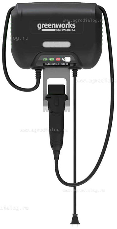 Зарядное устройство Greenworks GC82CH600 позволяет заряжать аккумуляторные батареи без извлечения их из минирайдера или райдера.