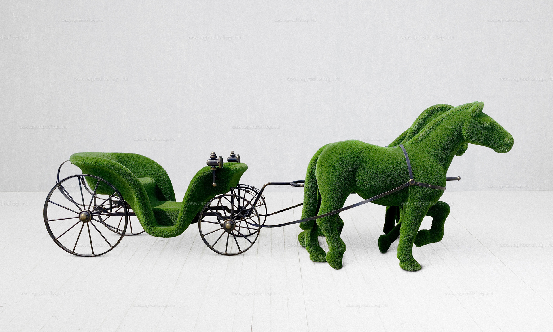 - Садовая фигура из искусственной травы «карета, запряженная тройкой лошадей» станет прекрасным украшением в течение всего года, так как ей не страшны осадки и сезонные перемены погоды.