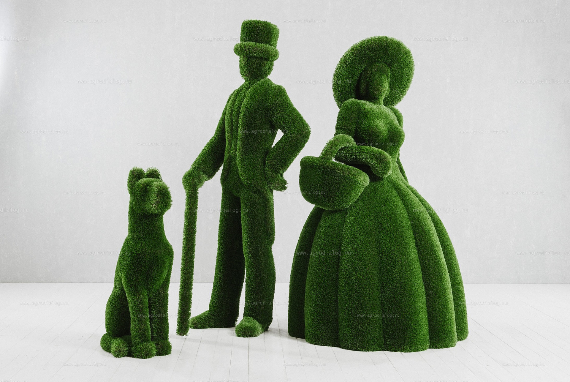 Для благоустройства вашего сада, базы отдыха или парка отлично подойдут садовые фигуры «дама с корзиной и джентльмен с собакой», с исполнением из искусственной травы премиального класса и стеклопластика.