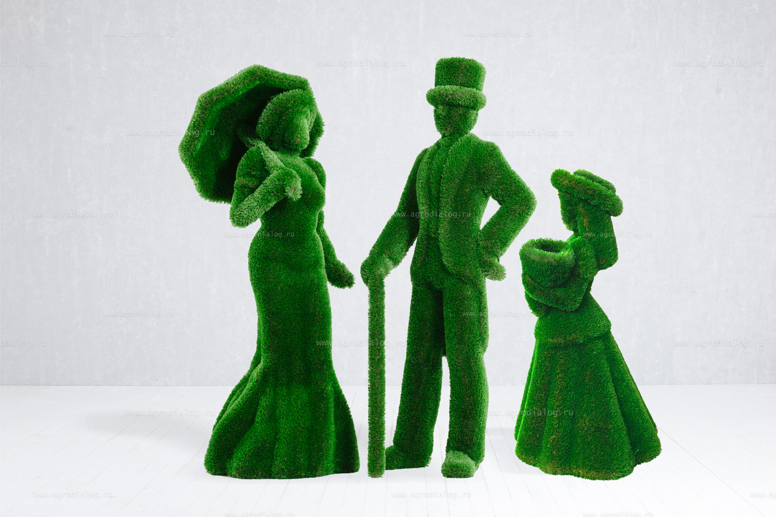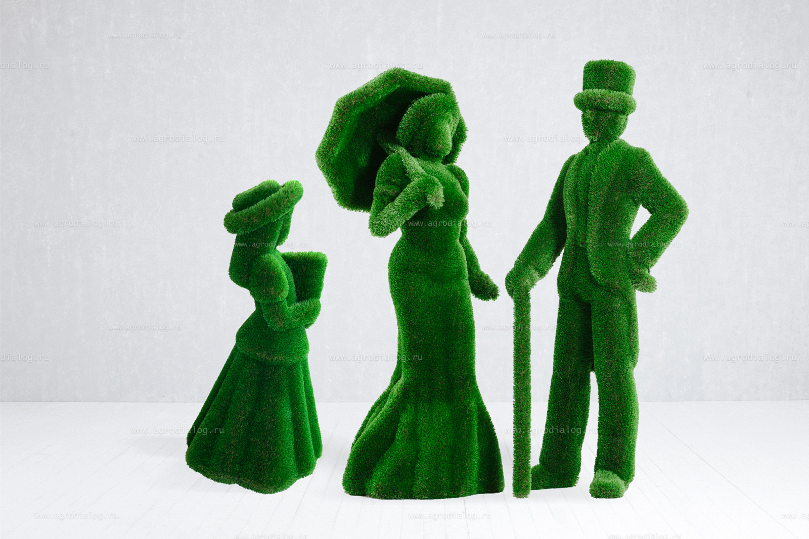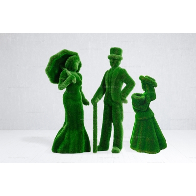 Для благоустройства вашего сада, базы отдыха или парка отлично подойдут садовые фигуры «дама с зонтом, джентльмен и девочка с букетом», с исполнением из искусственной травы премиального класса и стеклопластика.