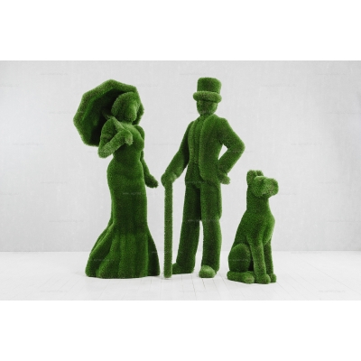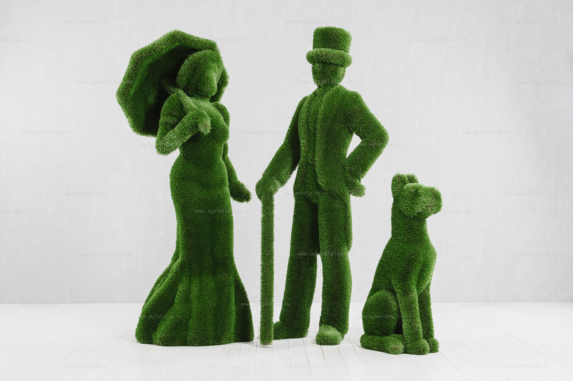 Для благоустройства вашего сада, базы отдыха или парка отлично подойдут садовые фигуры «дама с зонтом и джентльмен с собакой», с исполнением из искусственной травы премиального класса и стеклопластика.