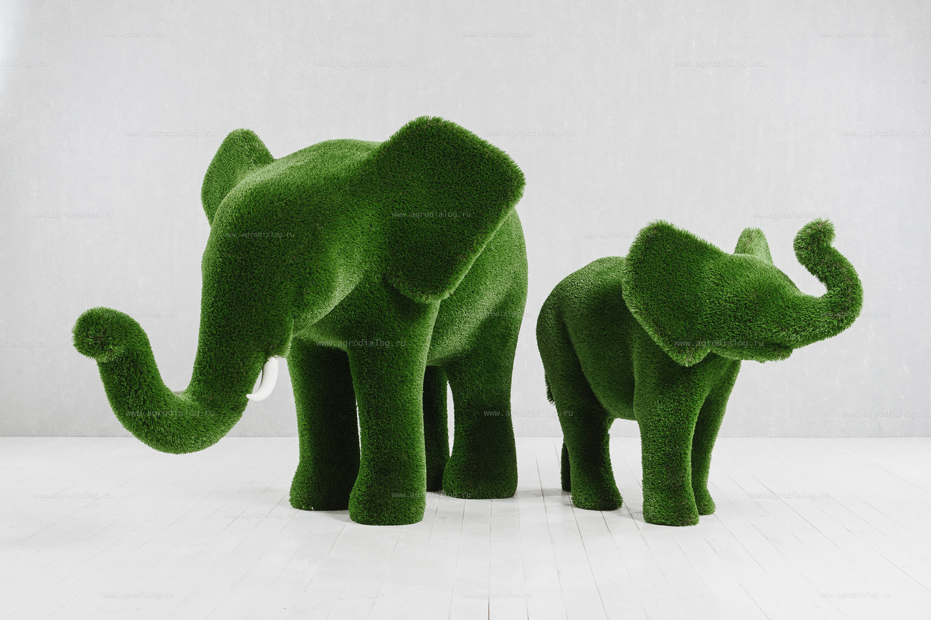 - Садовые фигуры из искусственной травы «два слона» станут прекрасным украшением в течение всего года, так как им не страшны осадки и сезонные перемены погоды.
