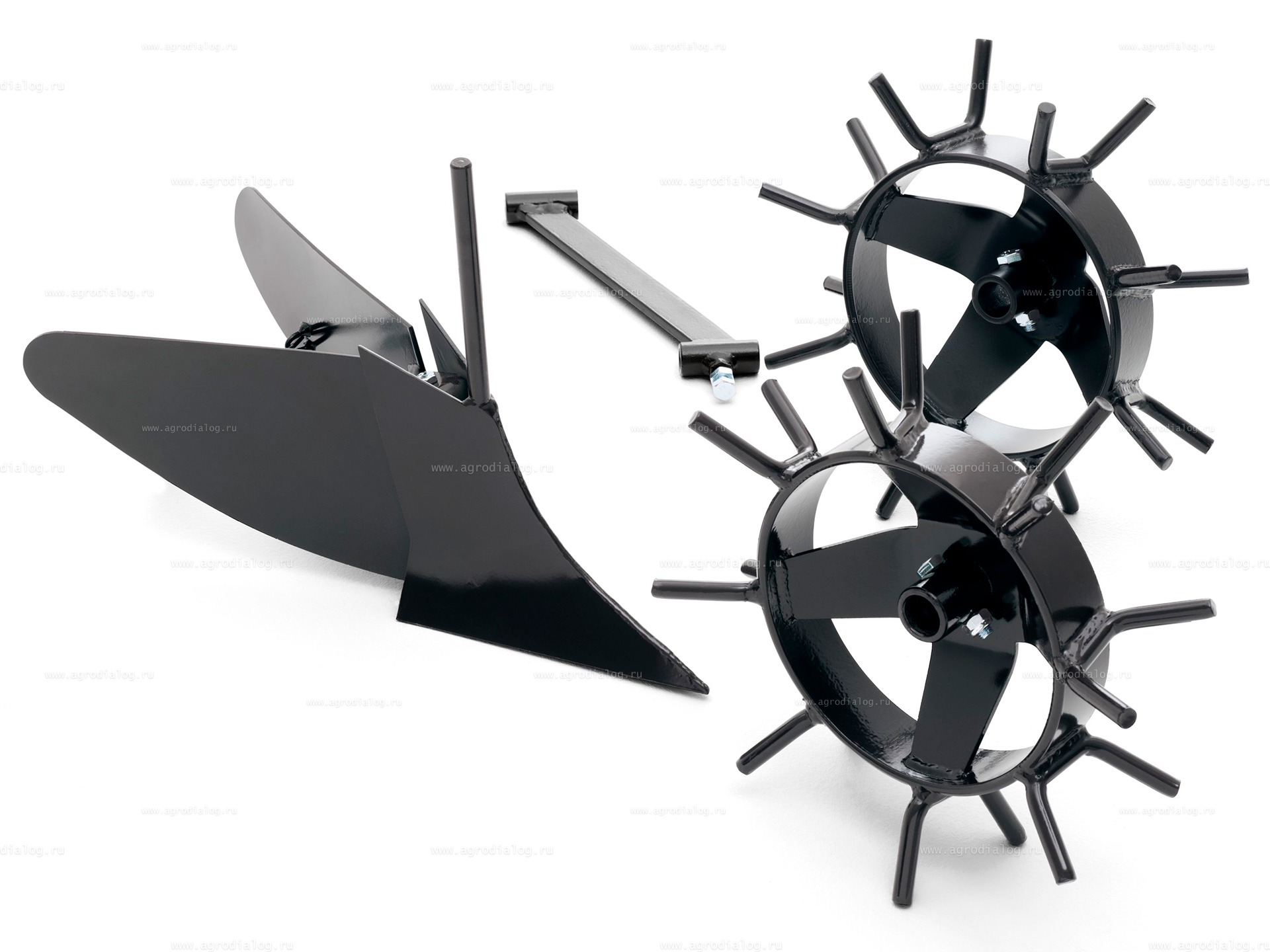 Окучник предназначен для нарезания борозд под посадку растений и окучивания почвы (рыхление почвы в междурядьях с одновременным приваливанием её из междурядий к нижним частям растений). Грунтозацепы предназначены для лучшего сцепления с почвой и обеспечения больших тяговых усилий культиватора при окучивании окучником. Установку грунтозацепов необходимо производить так, чтобы шипы были расположены гнутой вершиной по направлению движения. Сцепка предназначена для присоединения к культиватору окучника. Данный товар приобретается только в комплекте с культиватором.