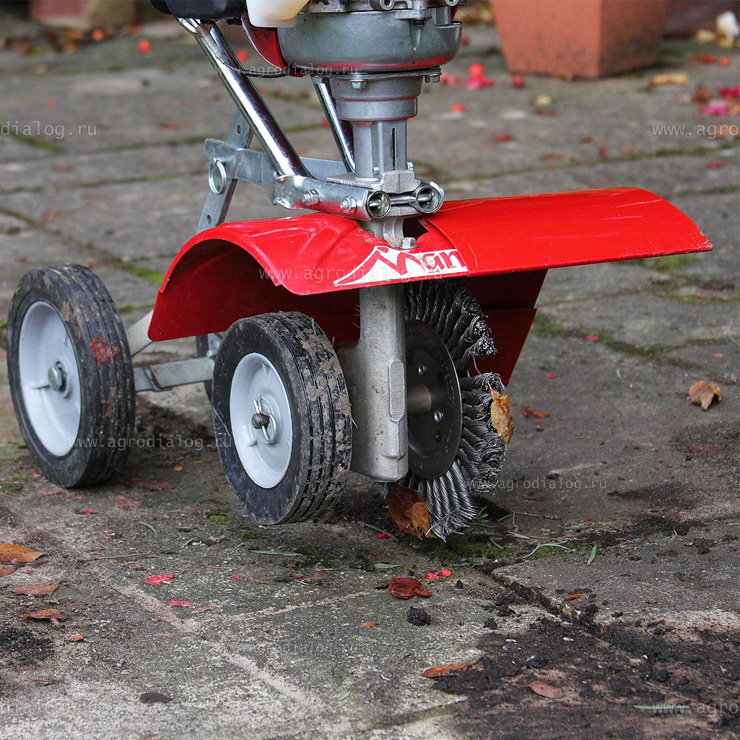 Щетка удаляет сорняки, мусор, грязь из трещин, щелей и других труднодоступных мест. Эта насадка состоит из колеса, диска с 37 жесткими стальными щетками и защитного козырька. Предположим, что в глубине своего сада вы соорудили пруд с кувшинками, а к нему по зеленой глади газона ведет петляющая дорожка из красиво выложенных плиток. Но очень скоро дорожку затянет непослушная трава и газон потеряет свои очертания. Вот тут-то она безжалостно выскоблит сорняки из любой щелочки.