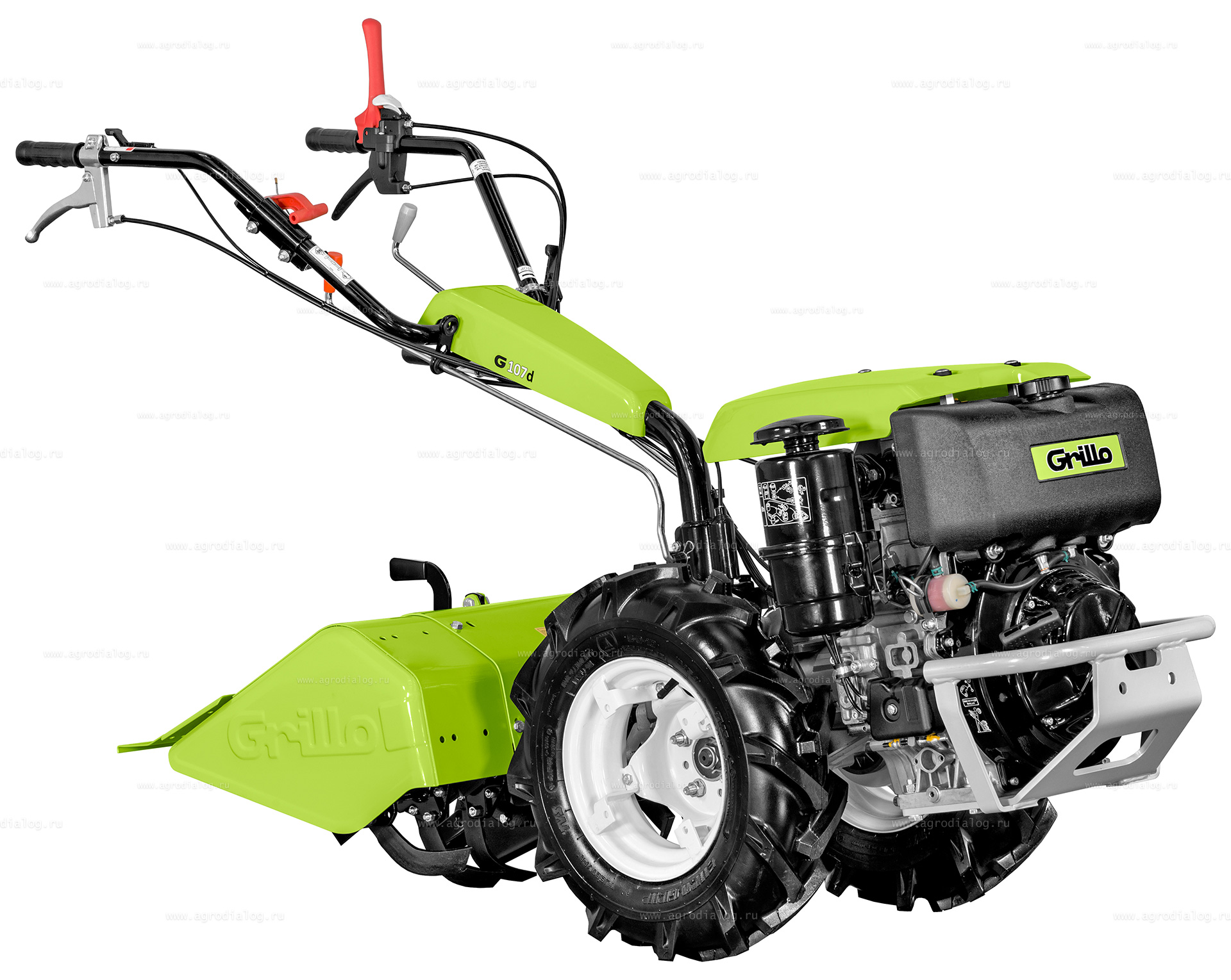 Мотоблок Grillo G 107d AE (Robin-Subaru) относится к классу профессиональных мотоблоков и является идеальным решением для собственников территорий, которым требуется сочетание многофункциональности и высокого уровня эргономики на площадях до нескольких гектар. Запуск двигателя производится простым поворотом ключа. Разблокируемый дифференциал значительно упрощает работу при маневрировании. Виброизолированная рулевая колонка - виброизоляция предназначена для гашения толчков передающихся от мотоблока на рукоятку управления, что обеспечивает комфортную работу. Уникальная конструкция рукоятки позволяет выбрать самое удобное положение для пользователя, что снижает утомляемость и повышает производительность труда. Реверсивная рулевая колонка позволяет менять направление работы мотоблока с различным навесным оборудованием. Накладки на рукоятках из специальной резины исключают проскальзывание, делают управление культиватором более комфортным. Благодаря профессиональной многоскоростной трансмиссии мотоблок Grillo G 107d AE (Robin-Subaru) справится с задачами любой сложности: убрать снег, подмести, скосить бурьян или газон, обработать почву, перевезти груз или заготовить сено. ВОМ и навесное оборудование автоматически отключается при включении заднего хода во избежание несчастных случаев. ВОМ имеет одну скорость - до 965 об/мин, независимо от скорости передвижения мотоблока. ВОМ оборудован быстроразъемной муфтой, что позволяет производить смену навесного оборудования в считанные секунды. Рычаг Motorstop - обеспечивает 100% безопасность во время работы. Как только оператор отпускает рукоятку, мотоблок Grillo G 107d AE (Robin-Subaru) и навесное оборудование немедленно останавливаются. В комплекте капот и колеса 4.00-10 с высокими сцепными свойствами для удобства работы с различным навесным оборудованием и обеспечения лучшего сцепления с грунтом. Капот обеспечивает защиту двигателя от пыли и удара. Все компоненты, от самых простых до самых сложных - все изготавливается компанией Grillo в Италии с использованием лучших материалов и самых современных технологий, что позволяет постоянно добиваться высокого качества под 100% контролем. Мотоблоки компании Grillo окрашиваются двойным слоем электростатической порошковой краски. Сначала выполняются промывочная и подготовительная ванна, затем поверхность грунтуют и проводят термическую обработку, это лучшая основа для нанесения окрасочных слоёв. После второго слоя краски проводится дополнительная термическая обработка при температуре 190°С, которая обеспечивает твёрдость и блеск. При завершающих приёмочных испытаниях мотоблок Grillo G 107d AE (Robin-Subaru) проверяется с включенным двигателем. Это ещё одна и заключительная гарантия высокого качества продукции.