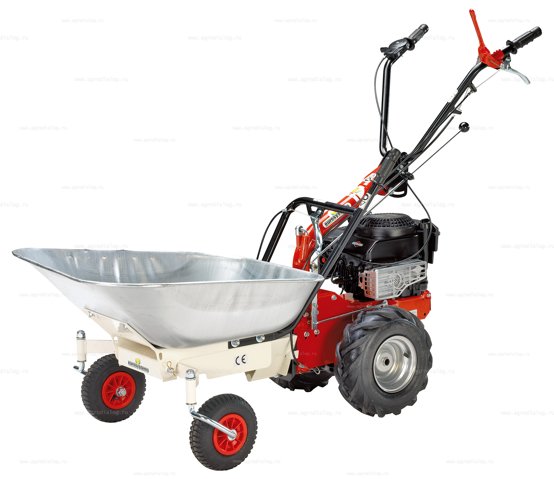 Насадка оцинкованная тачка 905255000 для Eurosystems P55. Она отлично подойдет для перевозки не только садового мусора, удобрений или урожая, но и более тяжелых материалов, таких как дрова, гравий, песок. Угол опрокидывания корыта 60°. Разгрузка производится просто - путем наклона корыта вперед при помощи специального рычага. Грузоподъемность - 100 кг. (75 кг. при работе на 35% склонах). Объём корыта - 85 литров.