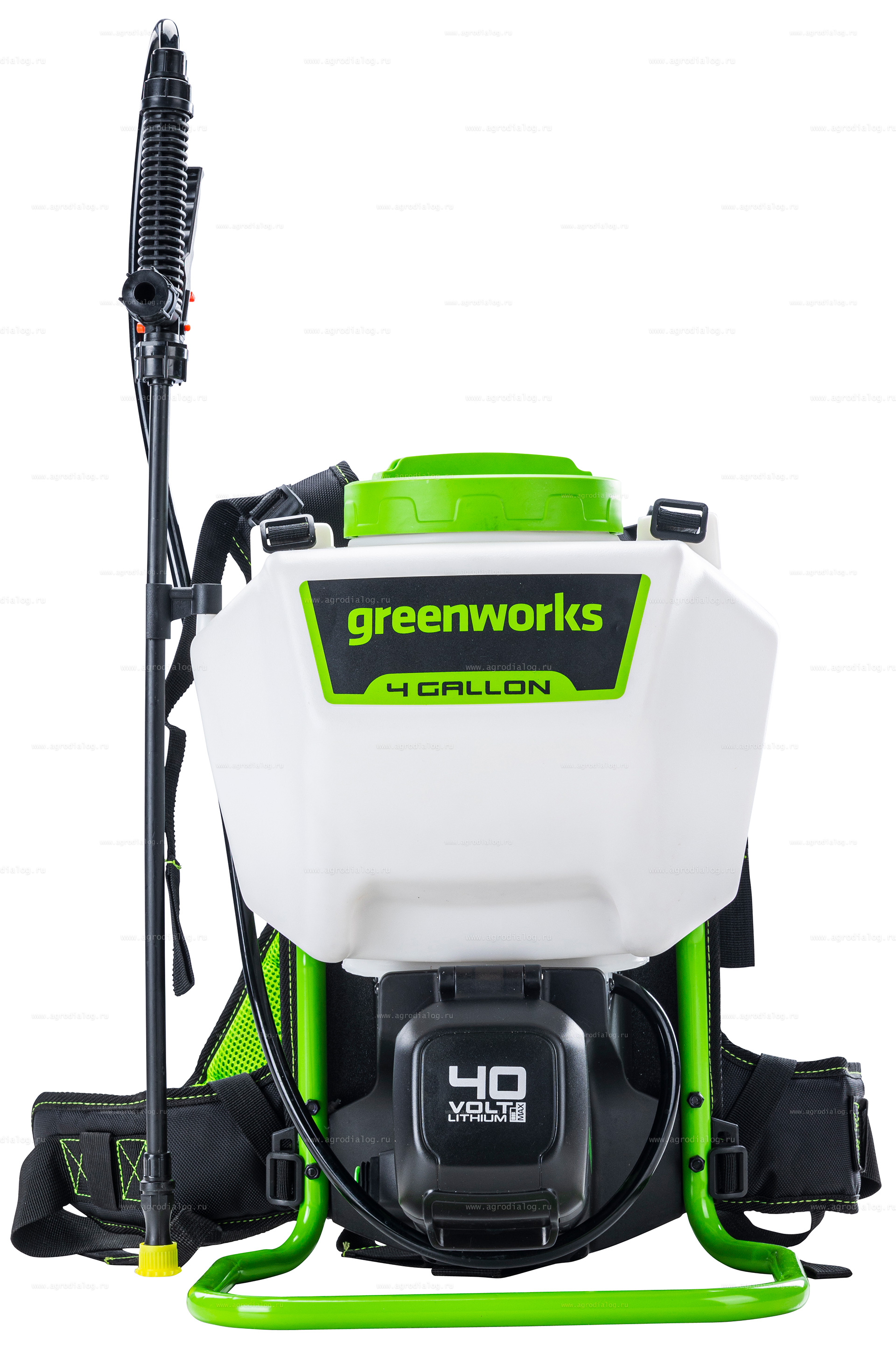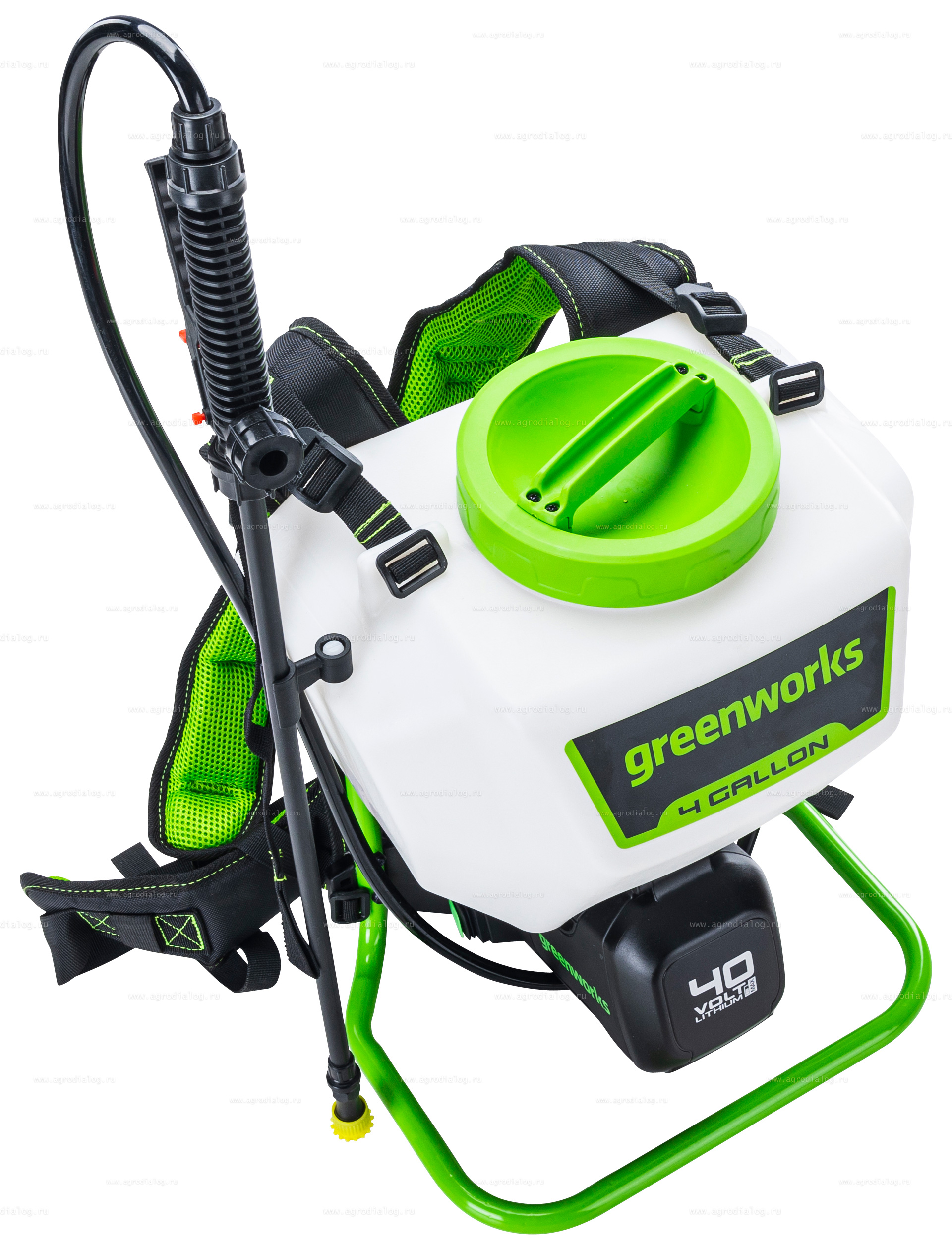 - Аккумуляторный опрыскиватель Greenworks G40BPS оснащен базовым комплектом из 5 насадок: конус, двойной конус, лейка, плоская и регулируемая форсунка.