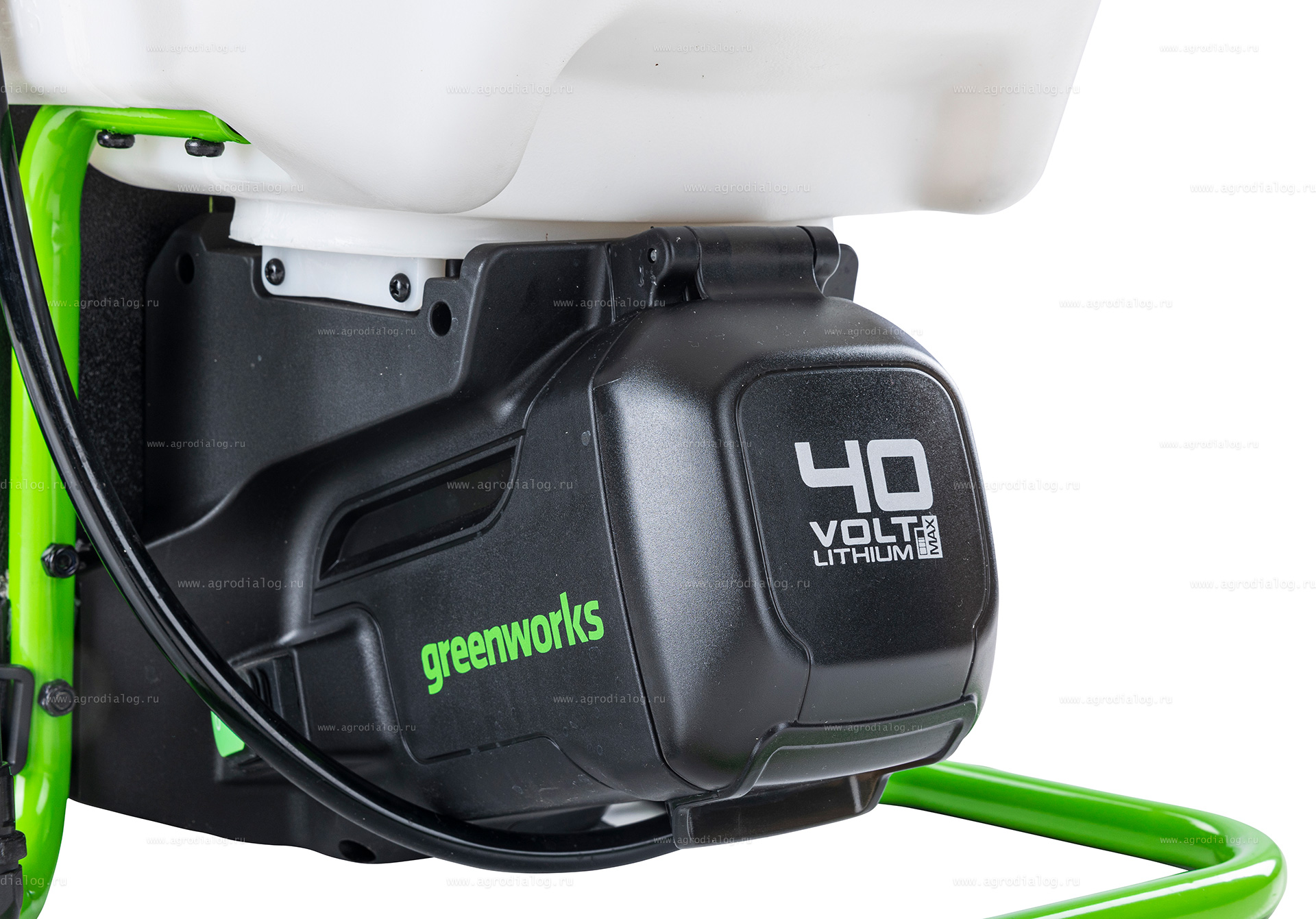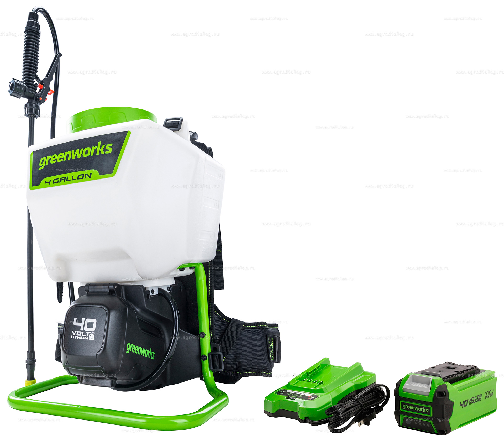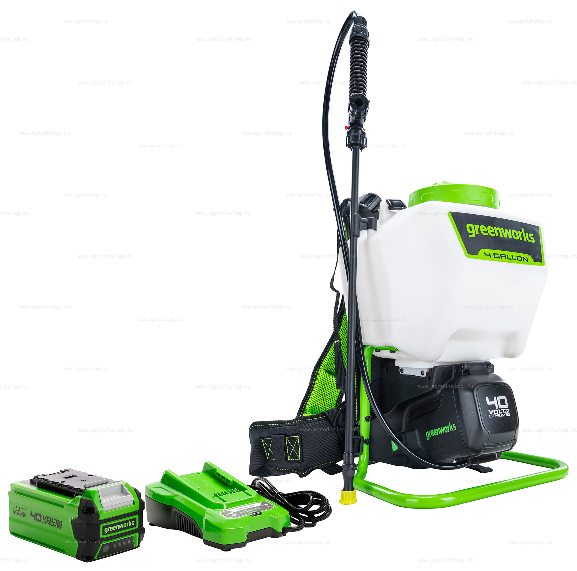 - Аккумуляторный опрыскиватель Greenworks G40BPSK4 оснащен базовым комплектом из 5 насадок: конус, двойной конус, лейка, плоская и регулируемая форсунка.