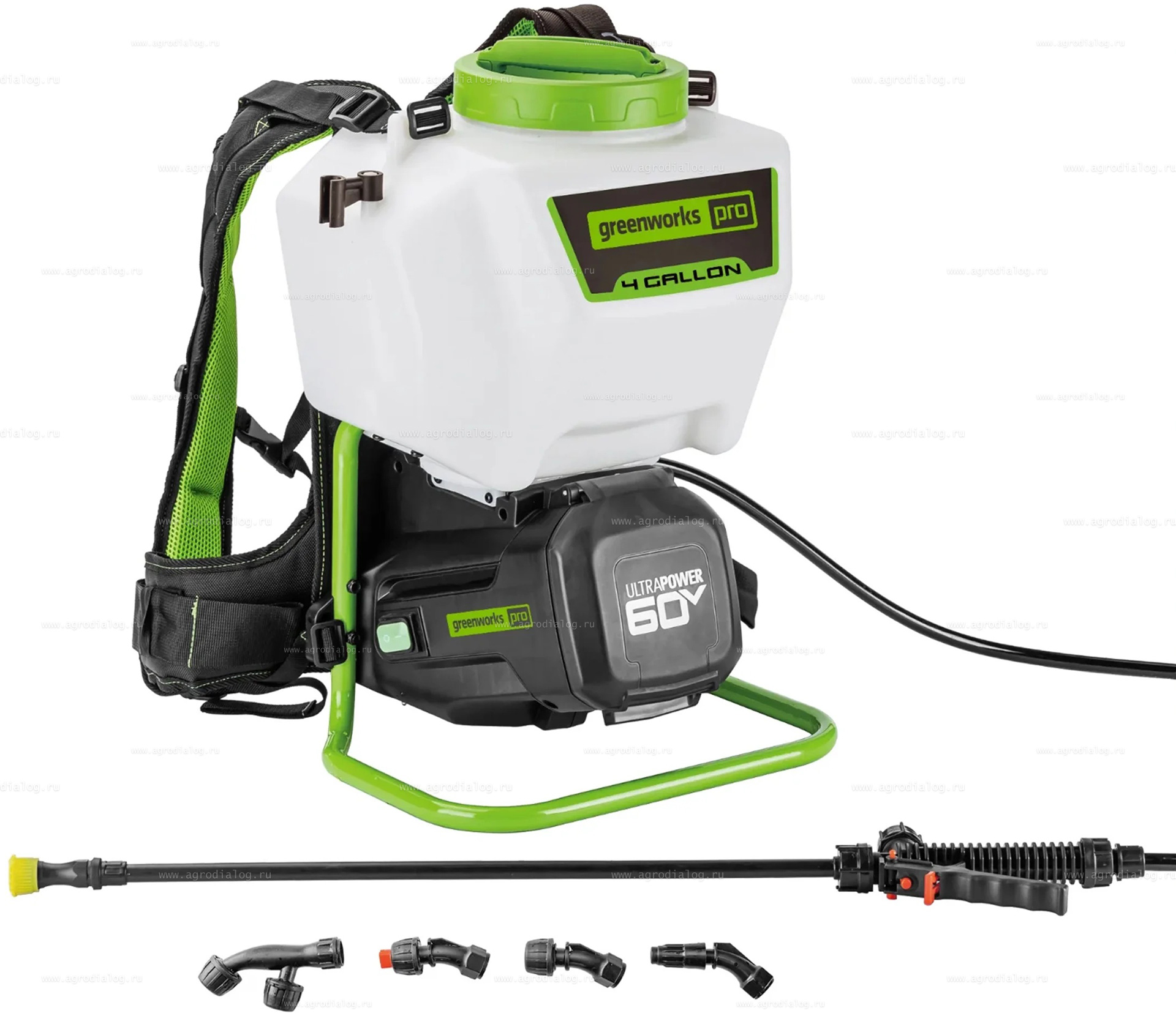 - Аккумуляторный опрыскиватель Greenworks GW-BPS60 оснащен базовым комплектом из 5 насадок: конус, двойной конус, лейка, плоская и регулируемая форсунка.