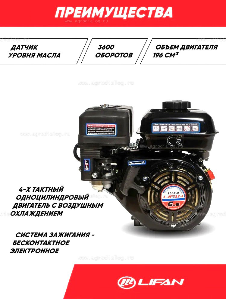 - Одноцилиндровый двигатель Lifan 168F отличается высокими эксплуатационными характеристиками, надежностью и собран из высококачественных компонентов.