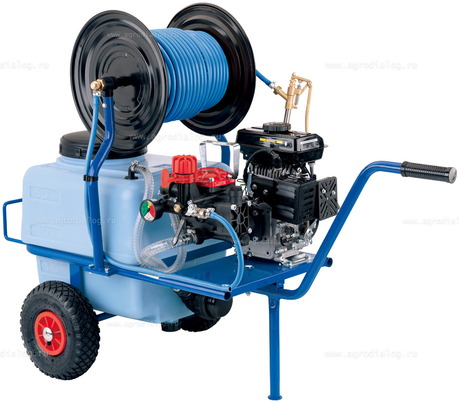 - Бензиновый опрыскиватель на колесах Annovi Reverberi 50 Lifan 152F оснащен 10 метровым шлангом высокого давления.