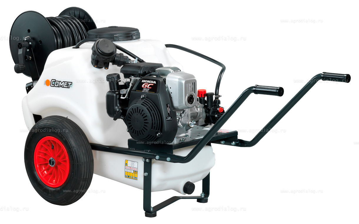 - Бензиновый опрыскиватель на колесах Comet 125 GC135 оснащен 50 метровым шлангом высокого давления на катушке.