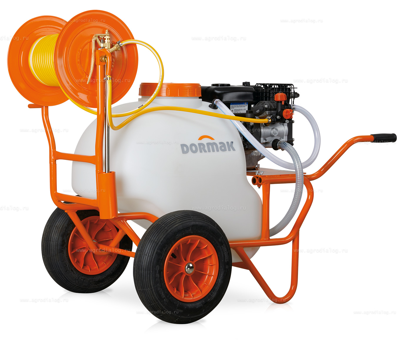 - Бензиновый опрыскиватель на колесах Dormak SD 100-25 оснащен 10-метровым шлангом высокого давления на катушке.