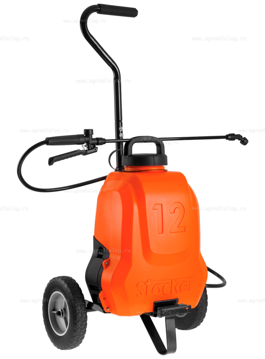 На тележке с колесами Stocker 1239/1 опрыскиватель удобно перемещать на большие расстояния, не нося его на себе, что по достоинству оценят особенно женщины и пожилые люди. Снятие и установка опрыскивателя на тележку производится очень просто и быстро, без использования инструментов. Размеры тележки (ШxГxВ): 44,5 x 35 x 97 см. Вес - 4,7 кг.