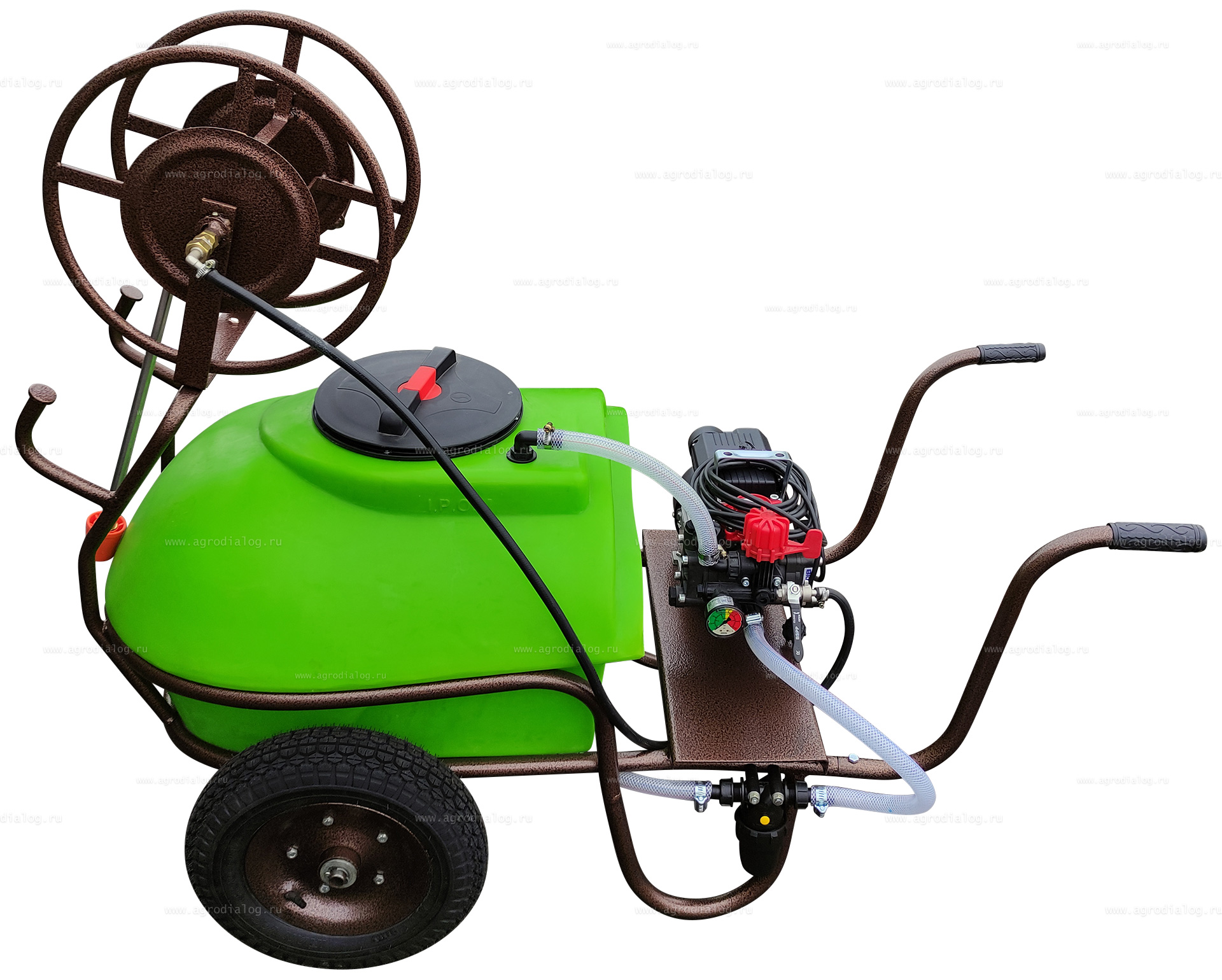 - Электрический опрыскиватель на колесах AGRO PUMP 100 оснащен 50 метровым шлангом высокого давления на катушке.