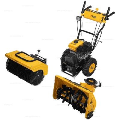 - Две насадки в комплекте поставки – щетка, роторный снегоуборщик.