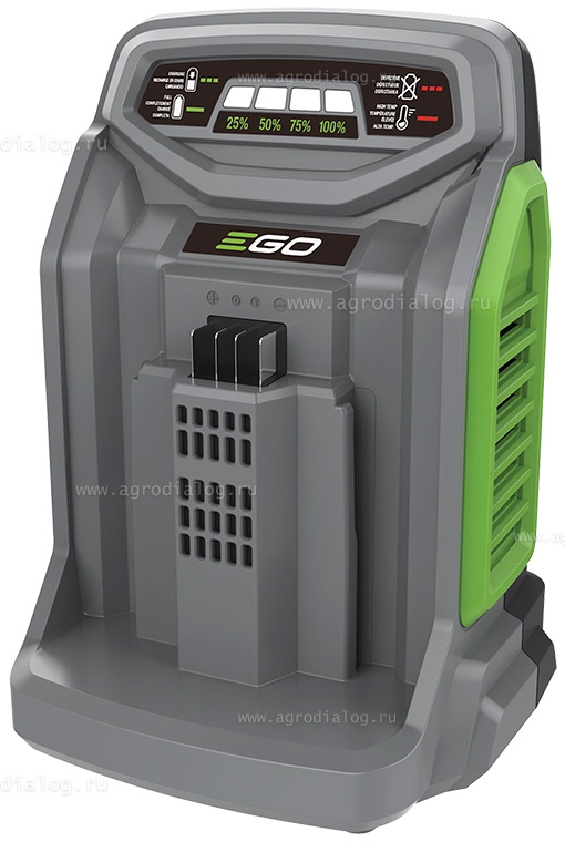 Зарядное устройство EGO CH5500 для простой и быстрой зарядки литий-ионных аккумуляторов. Данная модель обладает четырьмя индикаторами уровня заряда с шагом 25% и системой защиты от перезаряда аккумулятора. При достижении 100% заряда питание автоматически отключается. Устройство снабжено вентилятором и перфорацией для защиты от перегрева.