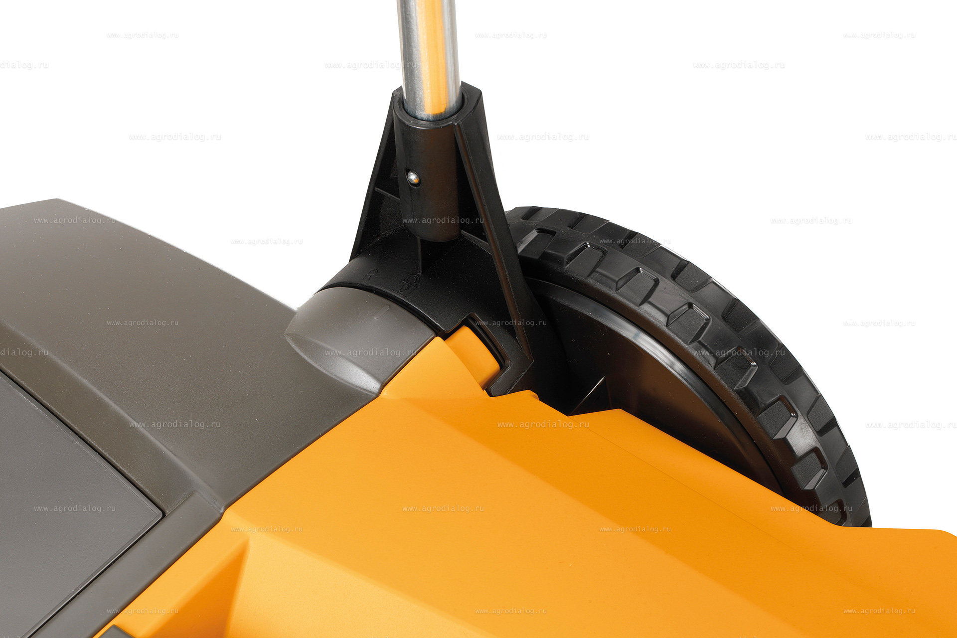 - Для плавного хода и комфортного использования подметальная машина оснащена прорезиненными колесами.