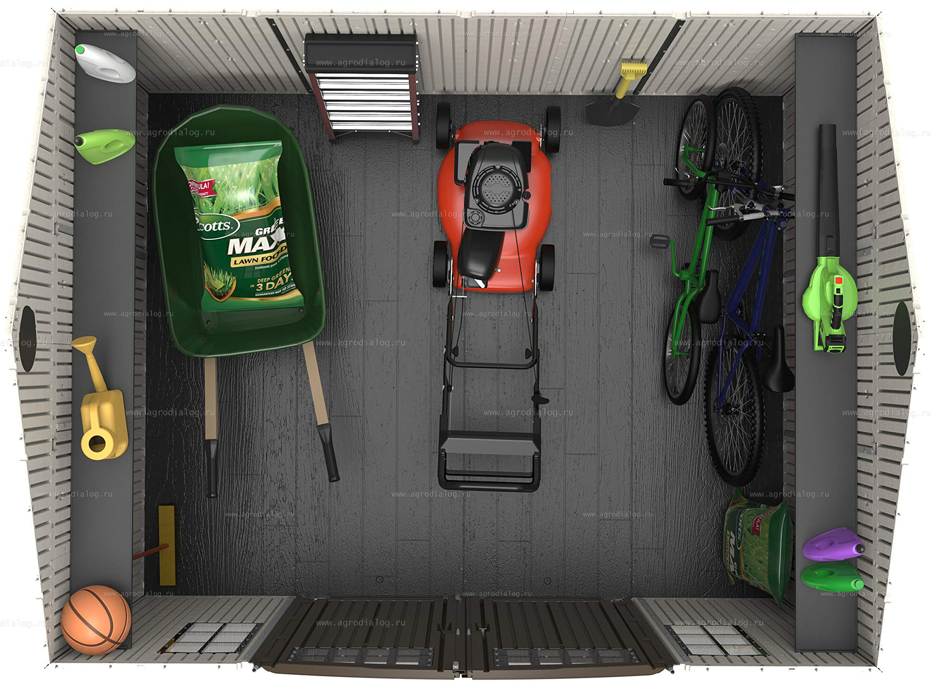 - Использовать как гараж для минитрактора, газонокосилки, снегоуборщика, квадроцикла, велосипедов, спортивного инвентаря.