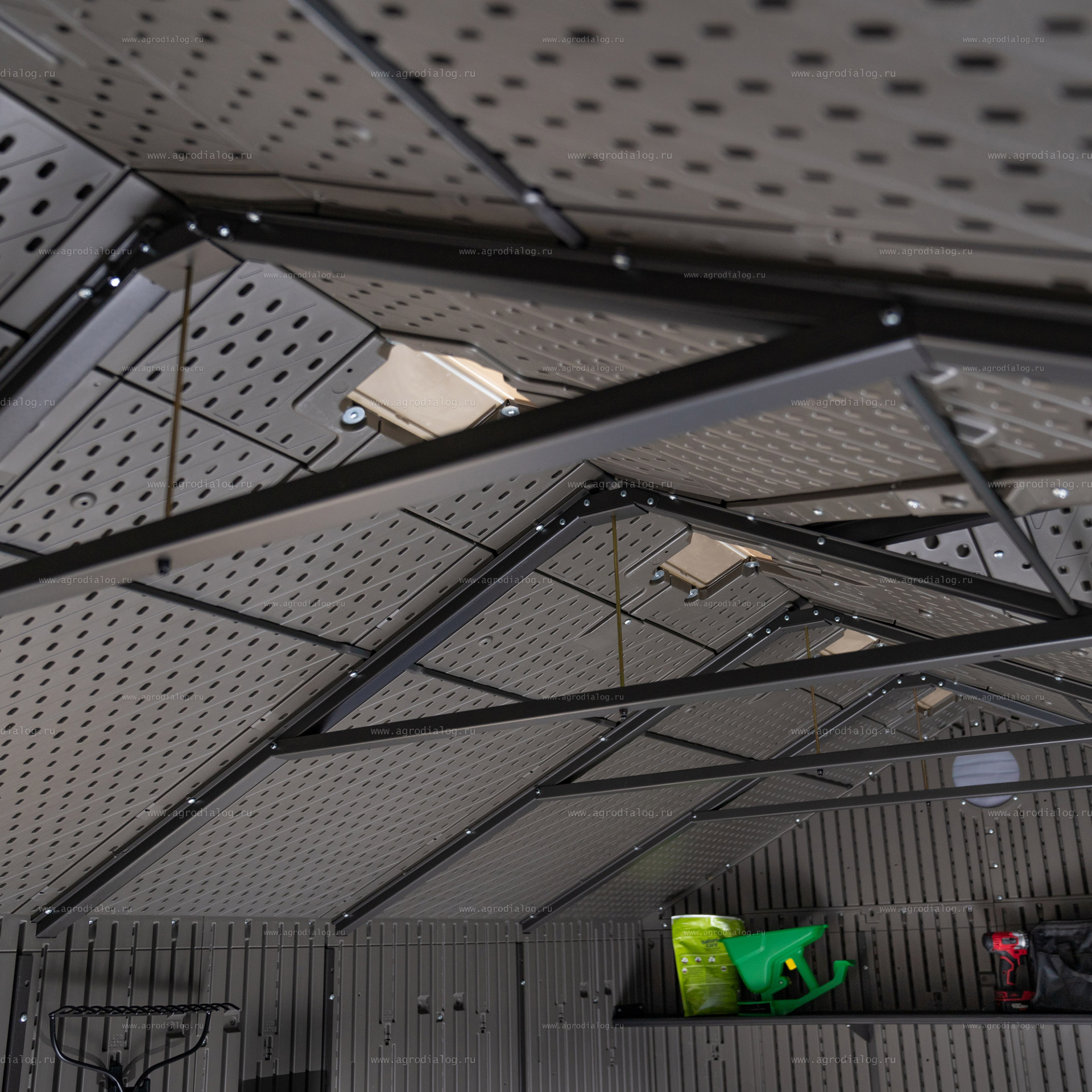 - Сарай комплектуется одной полкой размером 228,6 х 22,86 см, 2-мя угловыми полками, 12 настенными крючками.