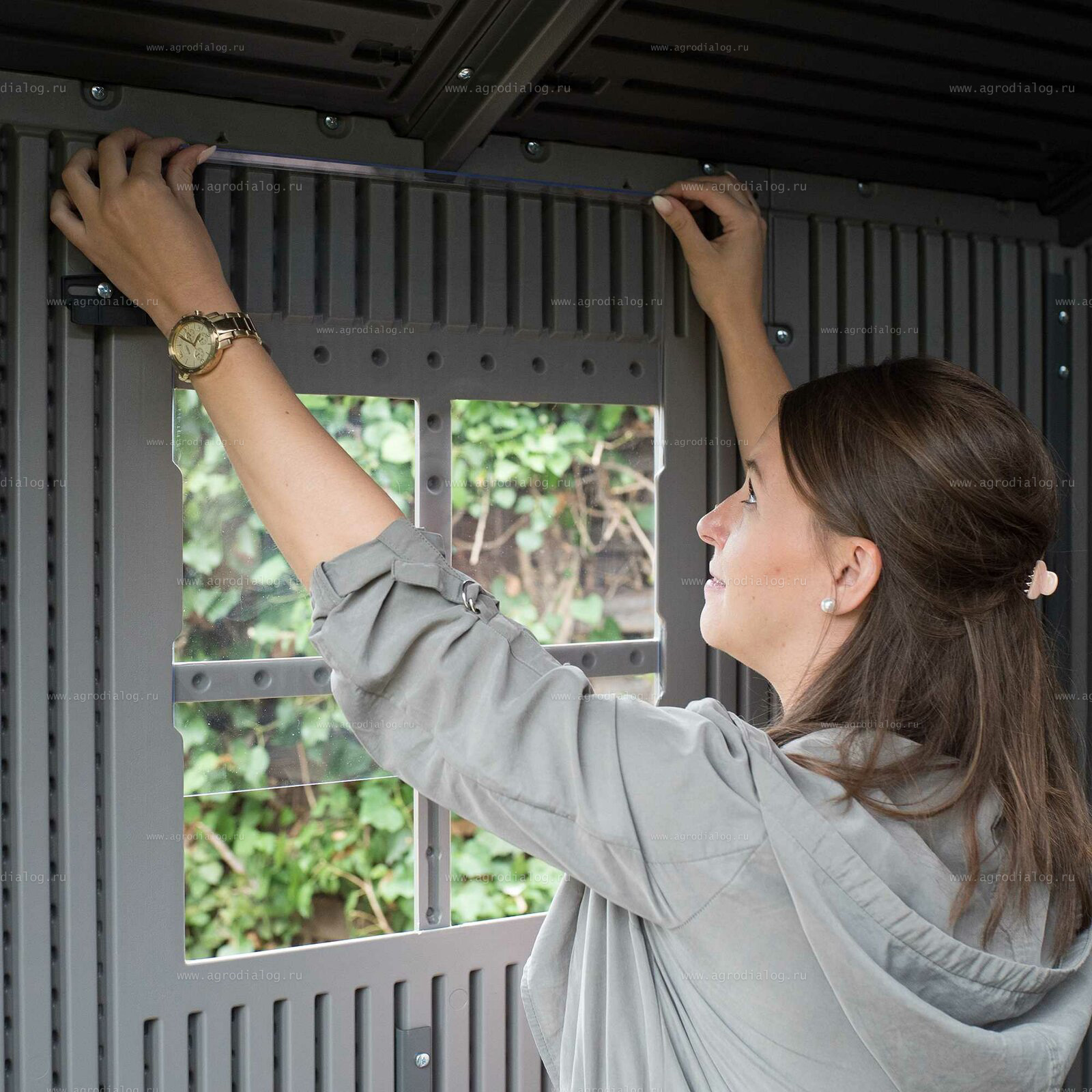 - Прозрачный конек и два открывающихся окна 58х31 см освещают постройку изнутри.