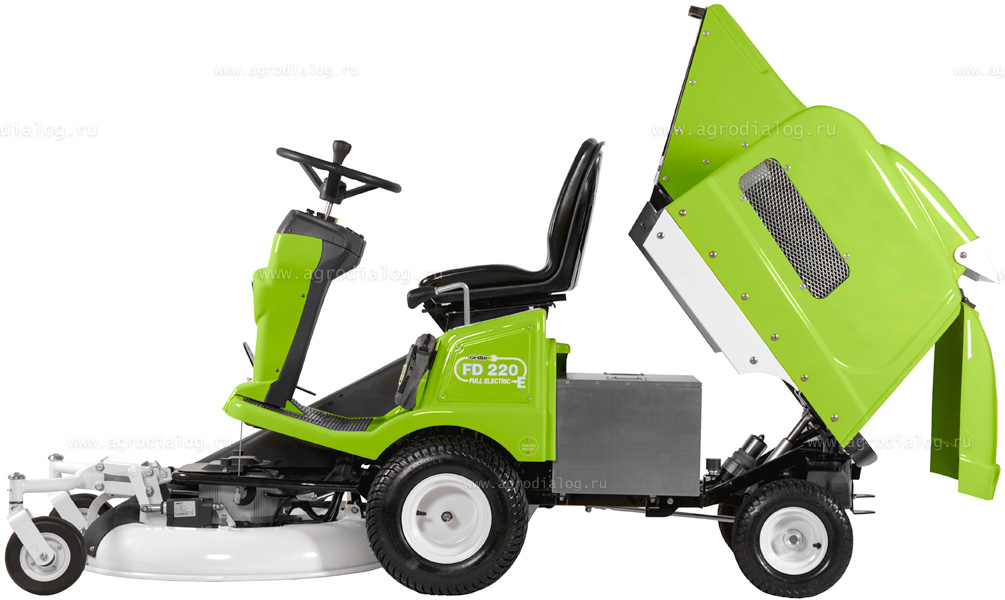 - Разгрузка заполненного травосборника осуществляется с помощью кнопки, расположенной сбоку от сиденья (электрический домкрат поднимает травосборник и полностью его разгружает).