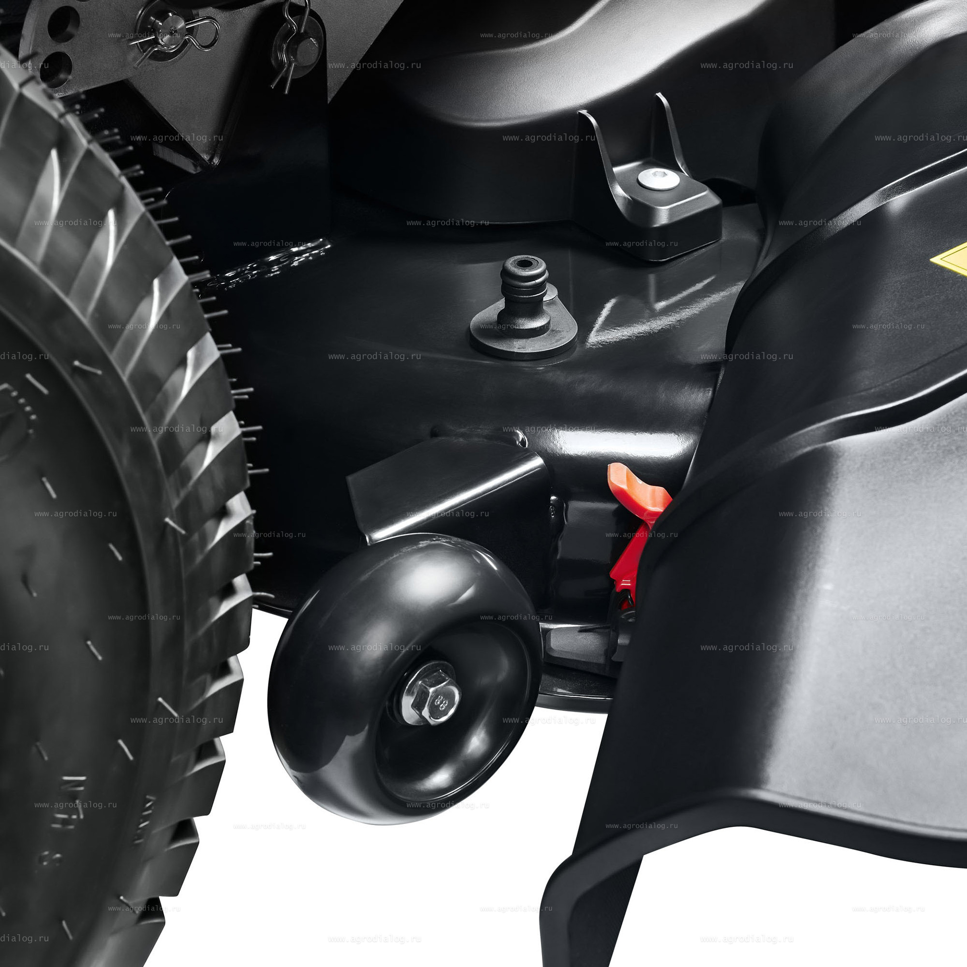 - Диапазон высоты кошения: 30–100 мм. Регулировка выполняется через специальную ручку, расположенной под правой рукой оператора, переведя ее в одно из девяти фиксированных положений. Для регулировки необходимо нажать педаль подъема режущей деки.