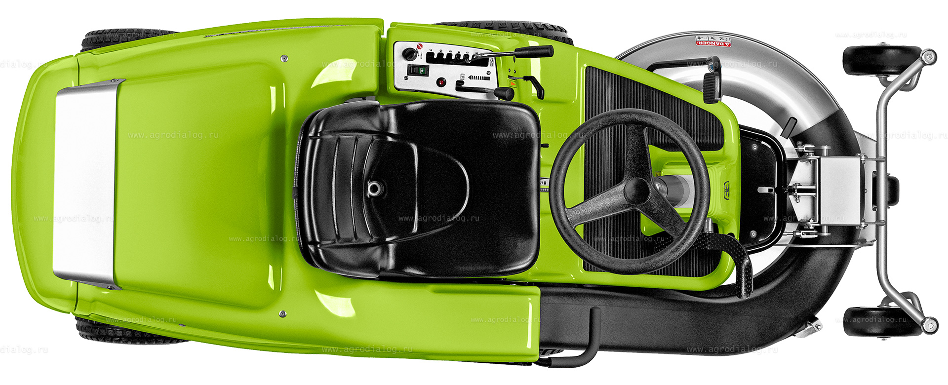 - Разгрузка полного травосборника выполняется очень просто. На заднем ходе достигнуть зоны разгрузки, достаточно поднять рычаг, находящийся слева от кресла, оставаясь в сидячем положении, и травосборник поднимается и полностью разгружается.