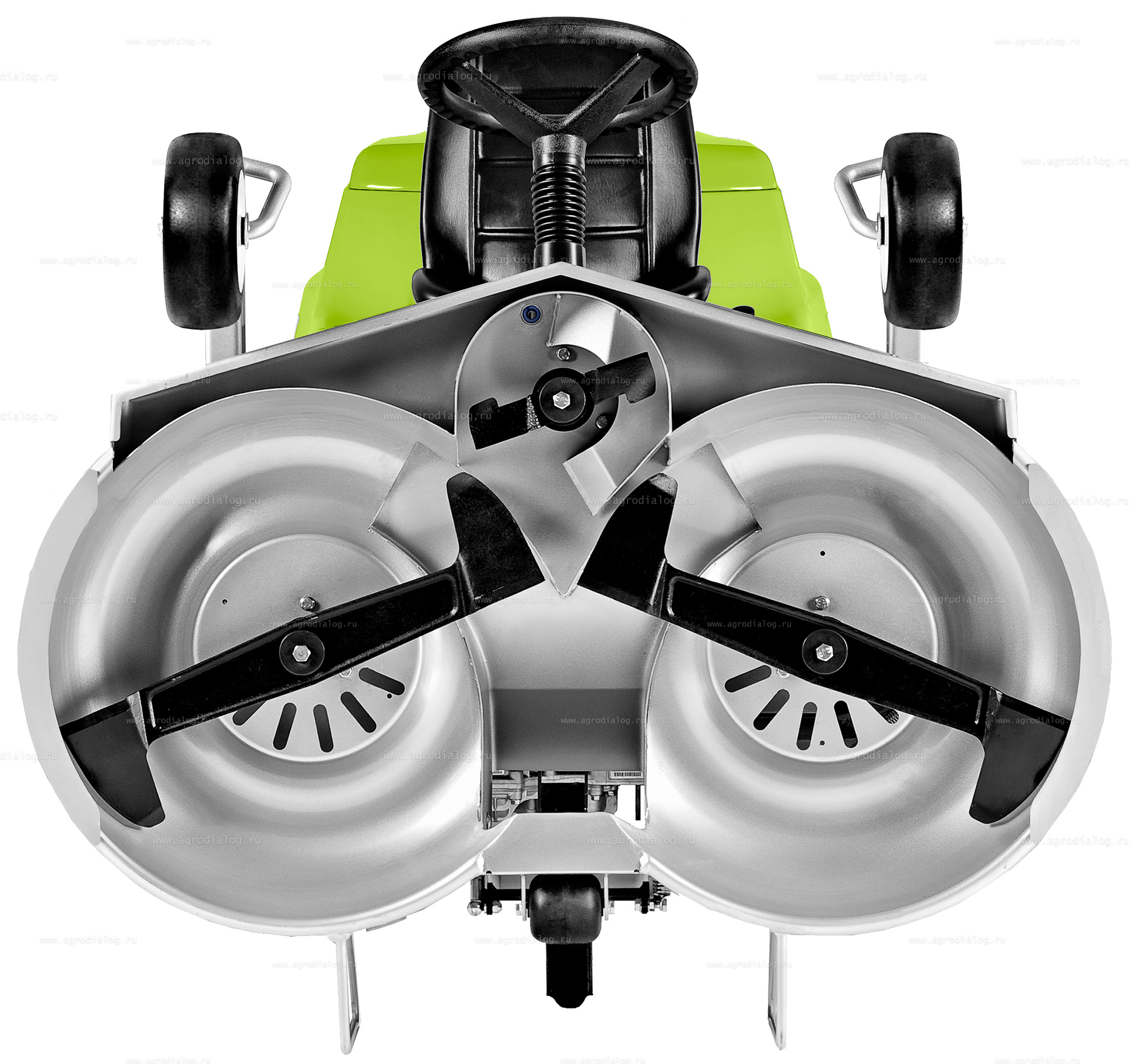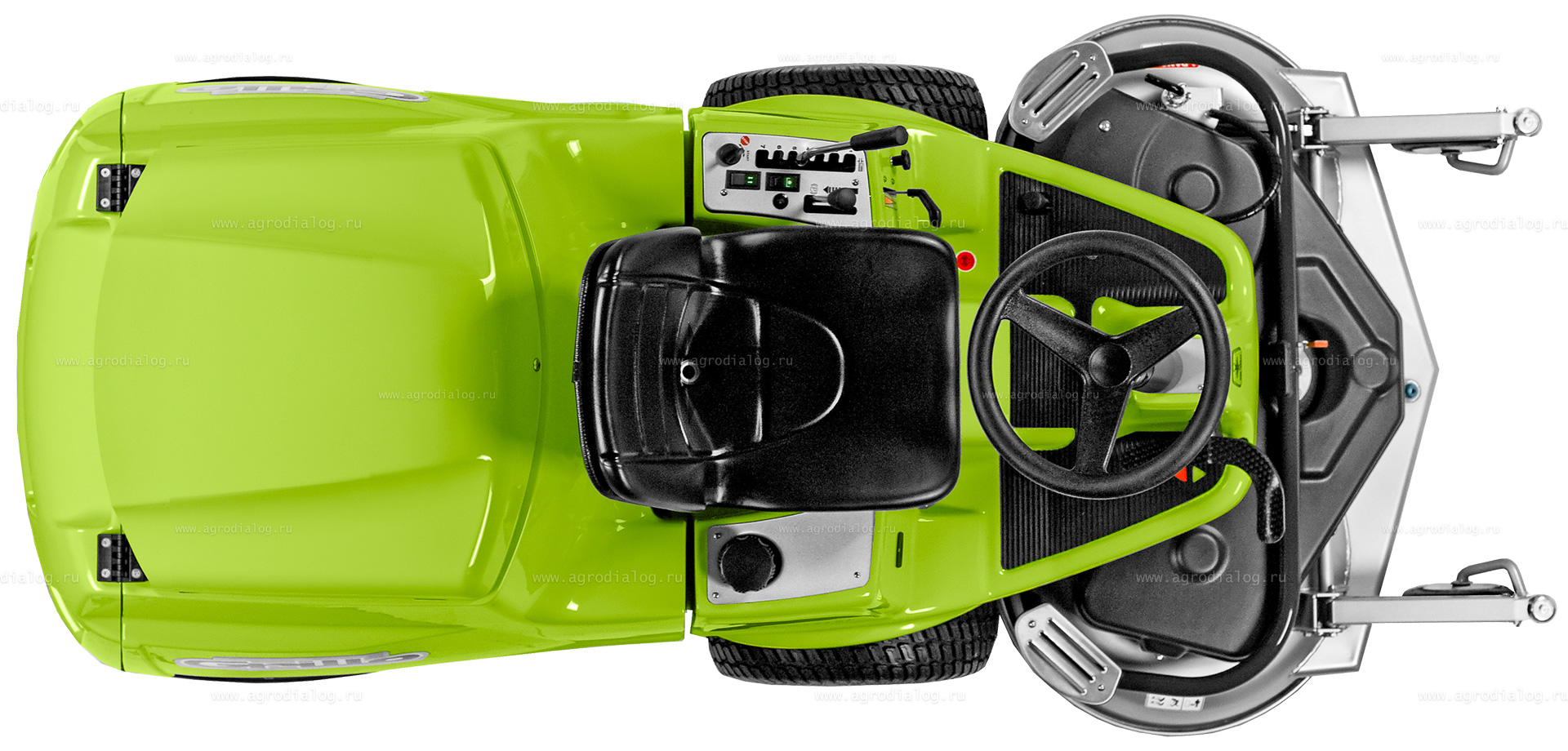 - Разгрузка полного травосборника выполняется кнопкой, которая находится сбоку от сидения (электрический домкрат поднимает травосборник и полностью его разгружает).