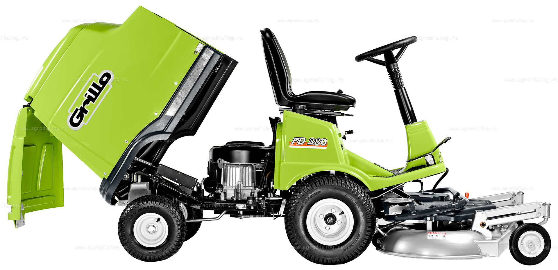 - Садовый райдер Grillo FD 280 с передней декой скашивает траву безукоризненно ровно, не приминая ее колесами перед скашиванием, сохраняя великолепную обзорность участка.