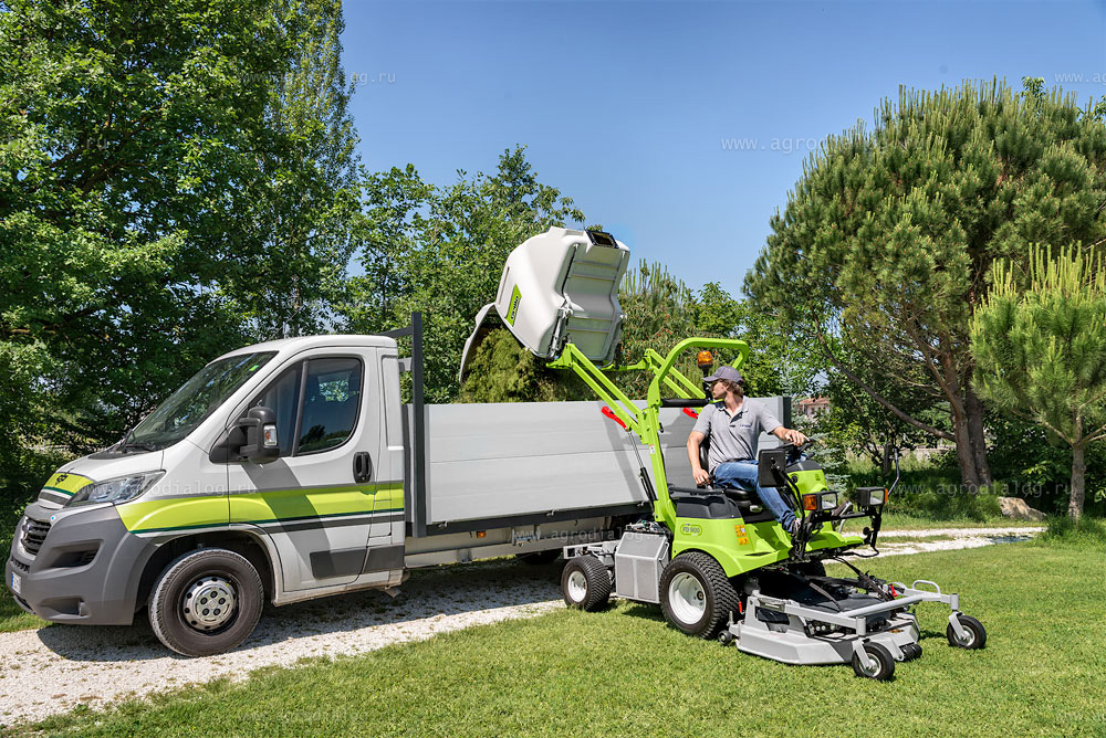 - Подъем и разгрузка травосборника с помощью рычагов управления с места оператора. Гидравлическая система позволяет поднять корзину на высоту 195 см на расстояние 30 см от корпуса райдера и разгрузить ее. При разгрузке открытие травосборника происходит автоматически.
