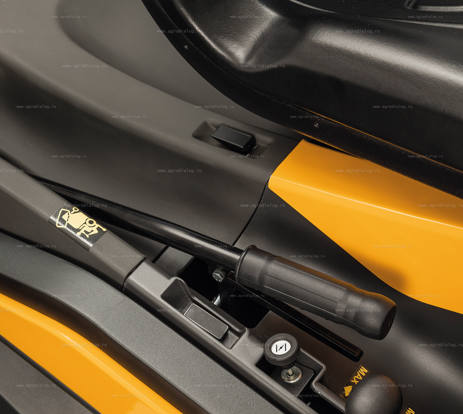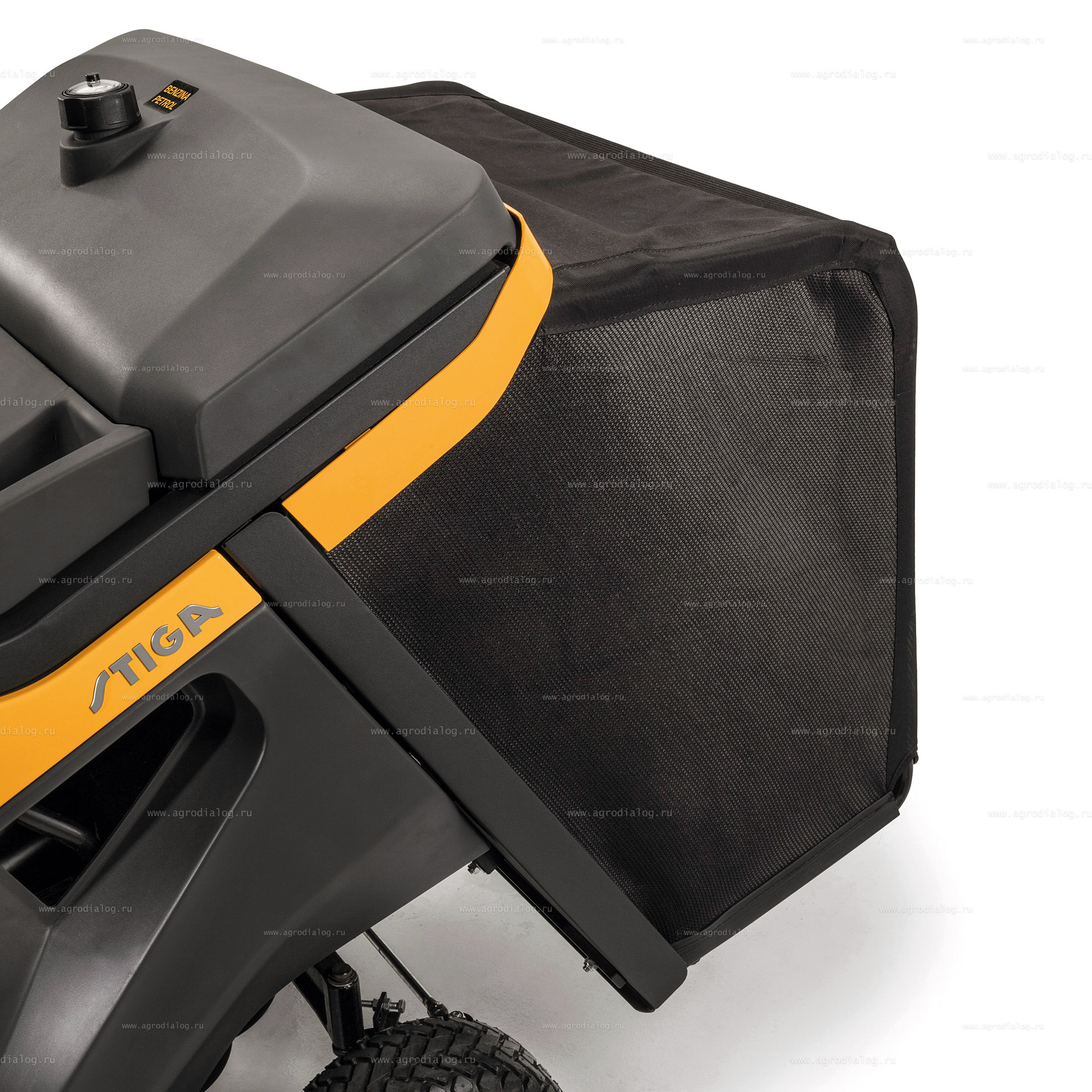 - Скошенная трава направляются в прямолинейный канал, который выводит её непосредственно в травосборник объёмом 280 литров. Звуковой сигнал предупреждает оператора о заполнении контейнера травой. Разгрузка полного травосборника выполняется очень просто. На заднем ходе достигнуть зоны разгрузки, достаточно поднять рычаг, оставаясь в сидячем положении, и травосборник поднимается и полностью разгружается. Дно травосборника снимается для осуществления заднего выброса.
