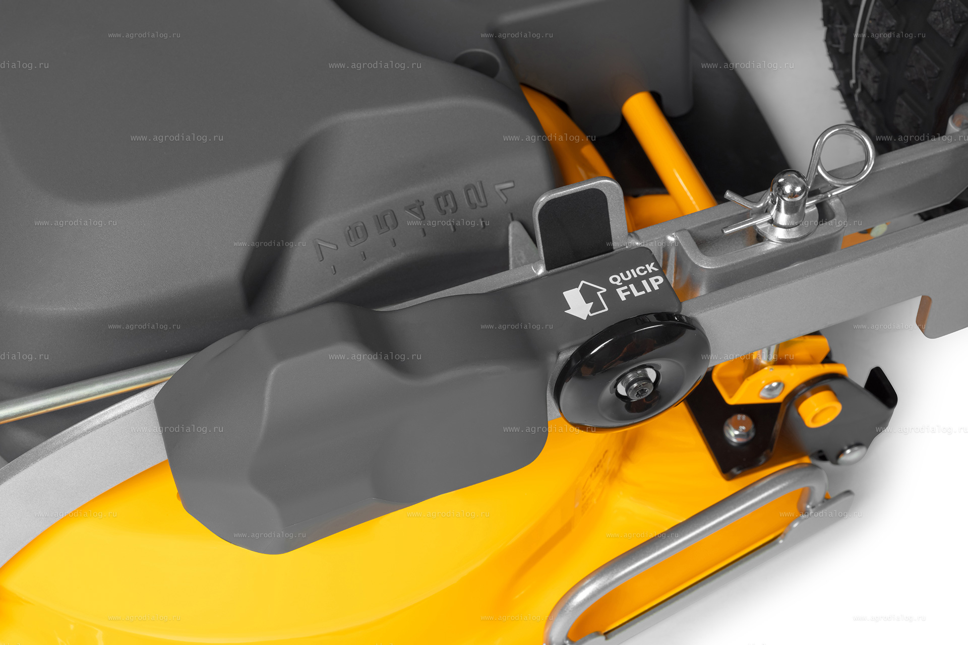 • Косильная дека приобретается отдельно, причем к райдеру подходит несколько видов дек разной ширины. Все деки имеют защитный бампер и отбортовку по периметру. Переднее расположение деки обеспечивает хороший обзор зоны обработки, позволяет косить в труднодоступных местах под кустарниками и скамейками.