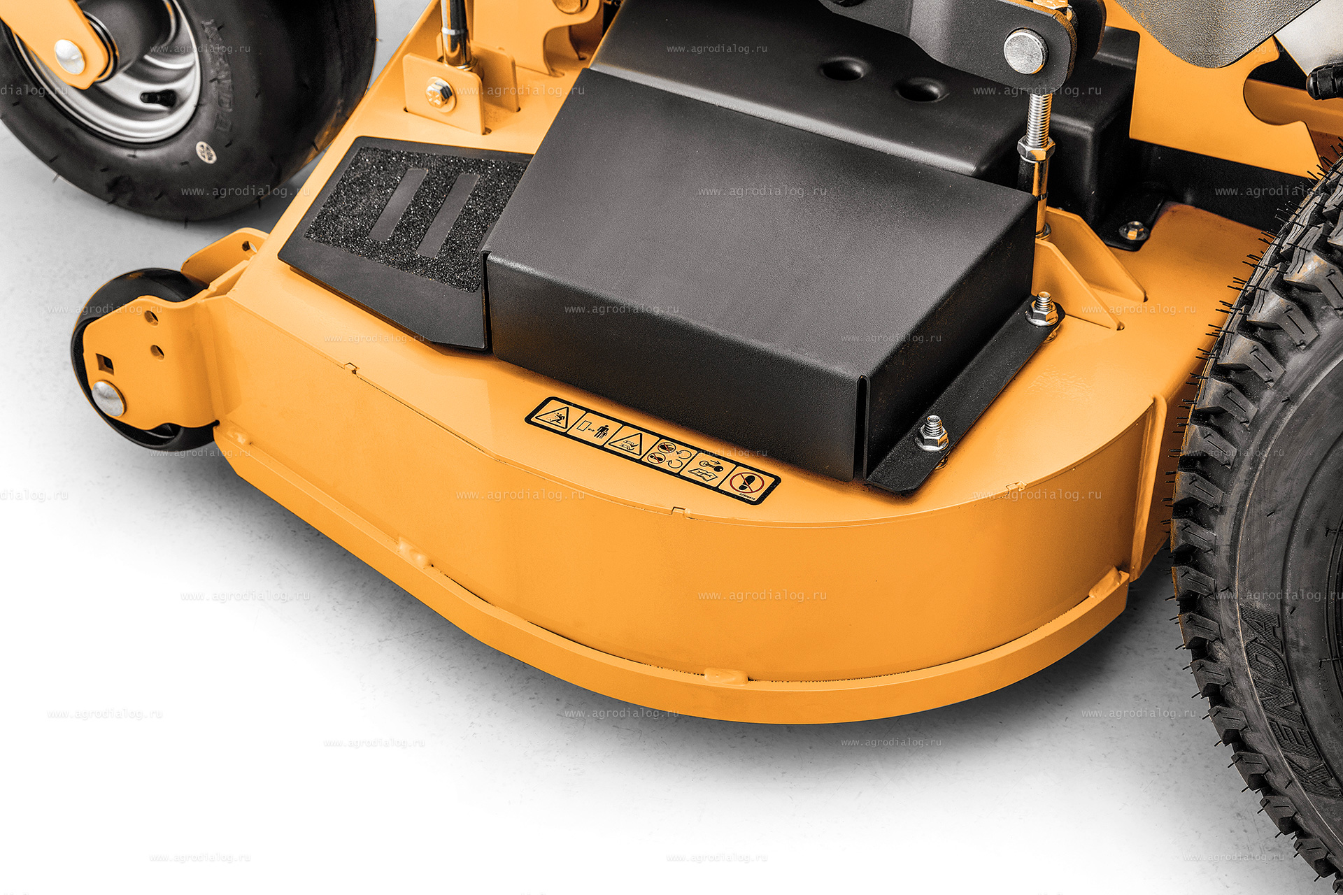 - Режущая дека оснащена колесами, предотвращающими повреждения газона, что особенно важно при обработке неровных участков.