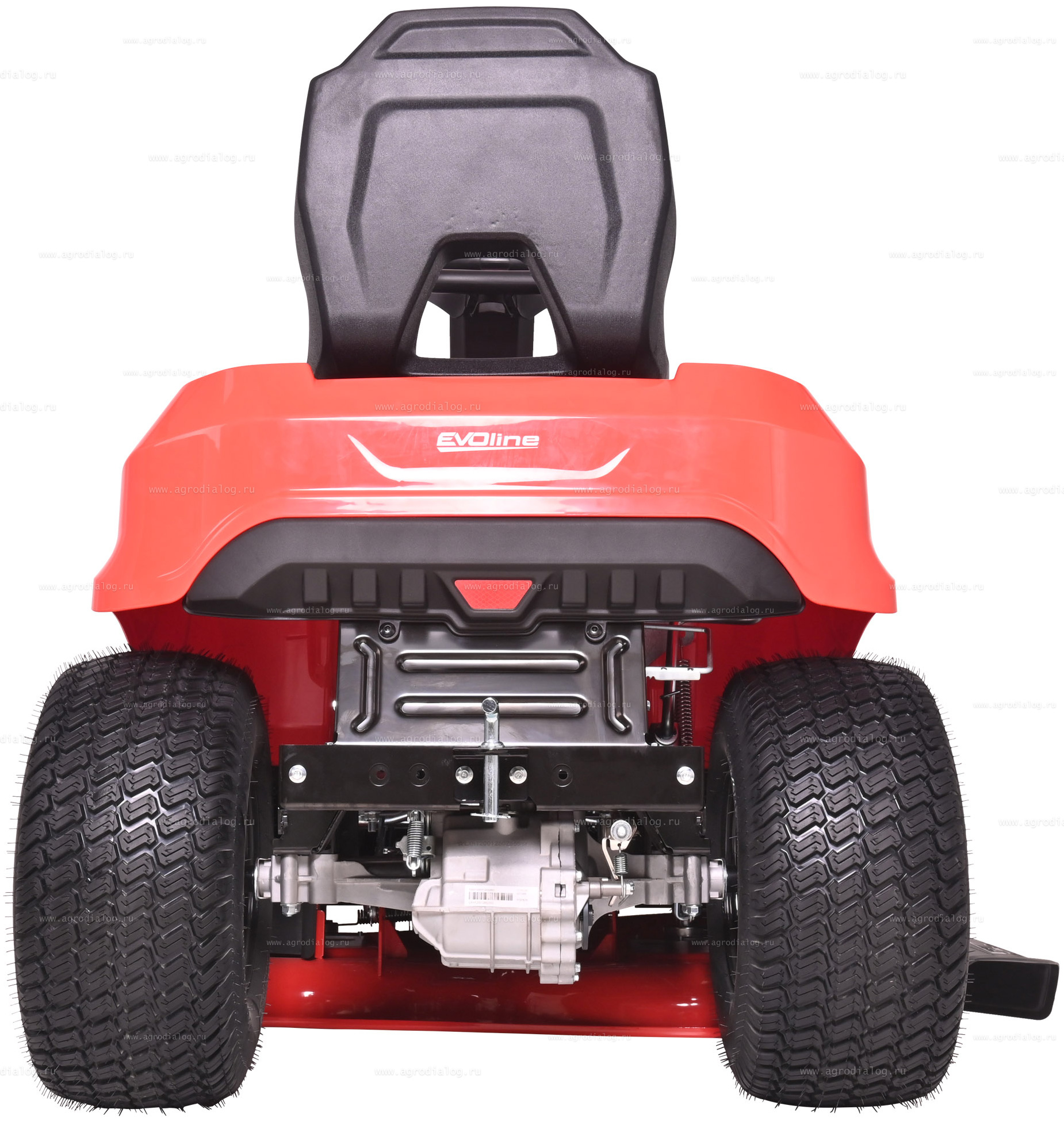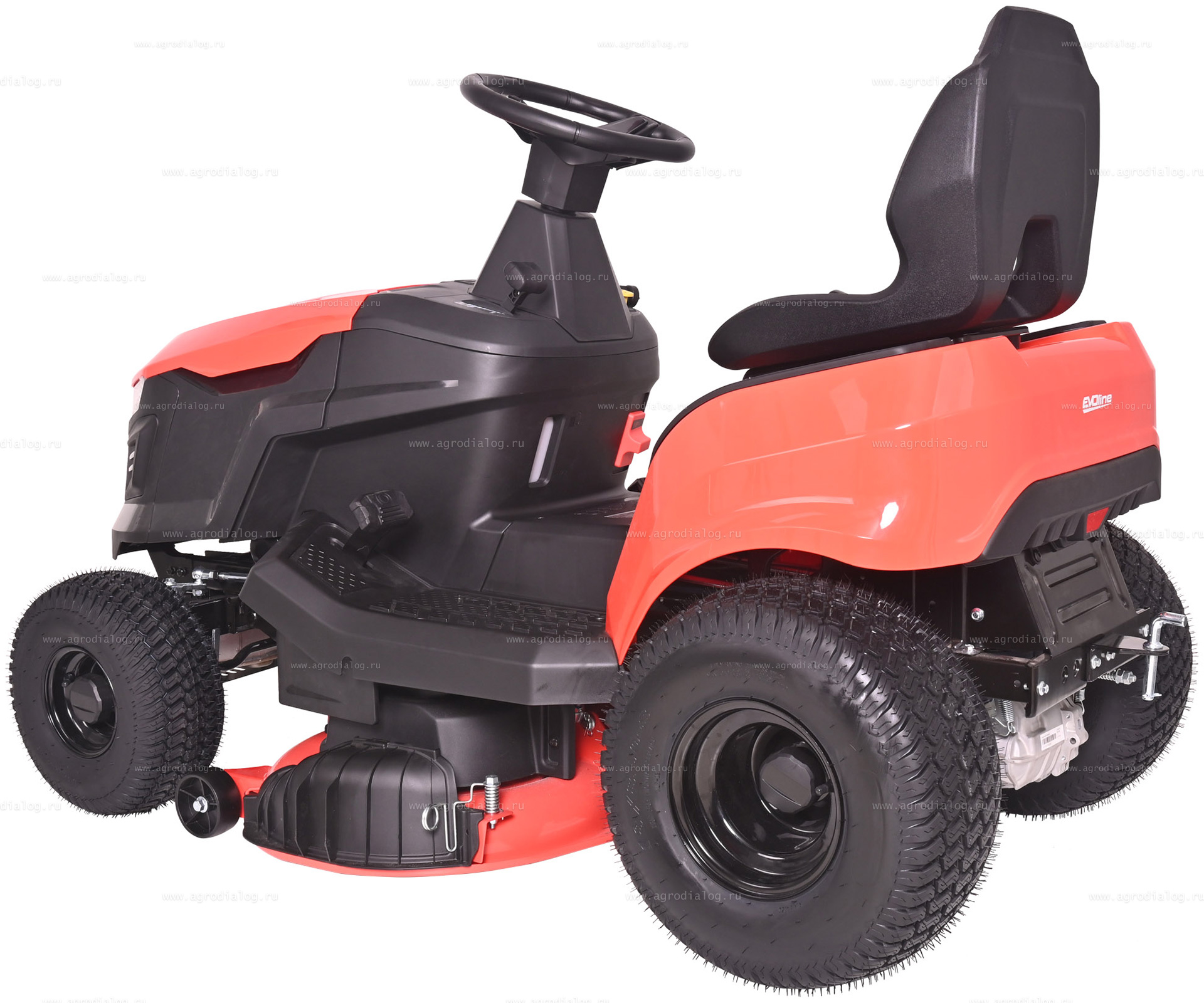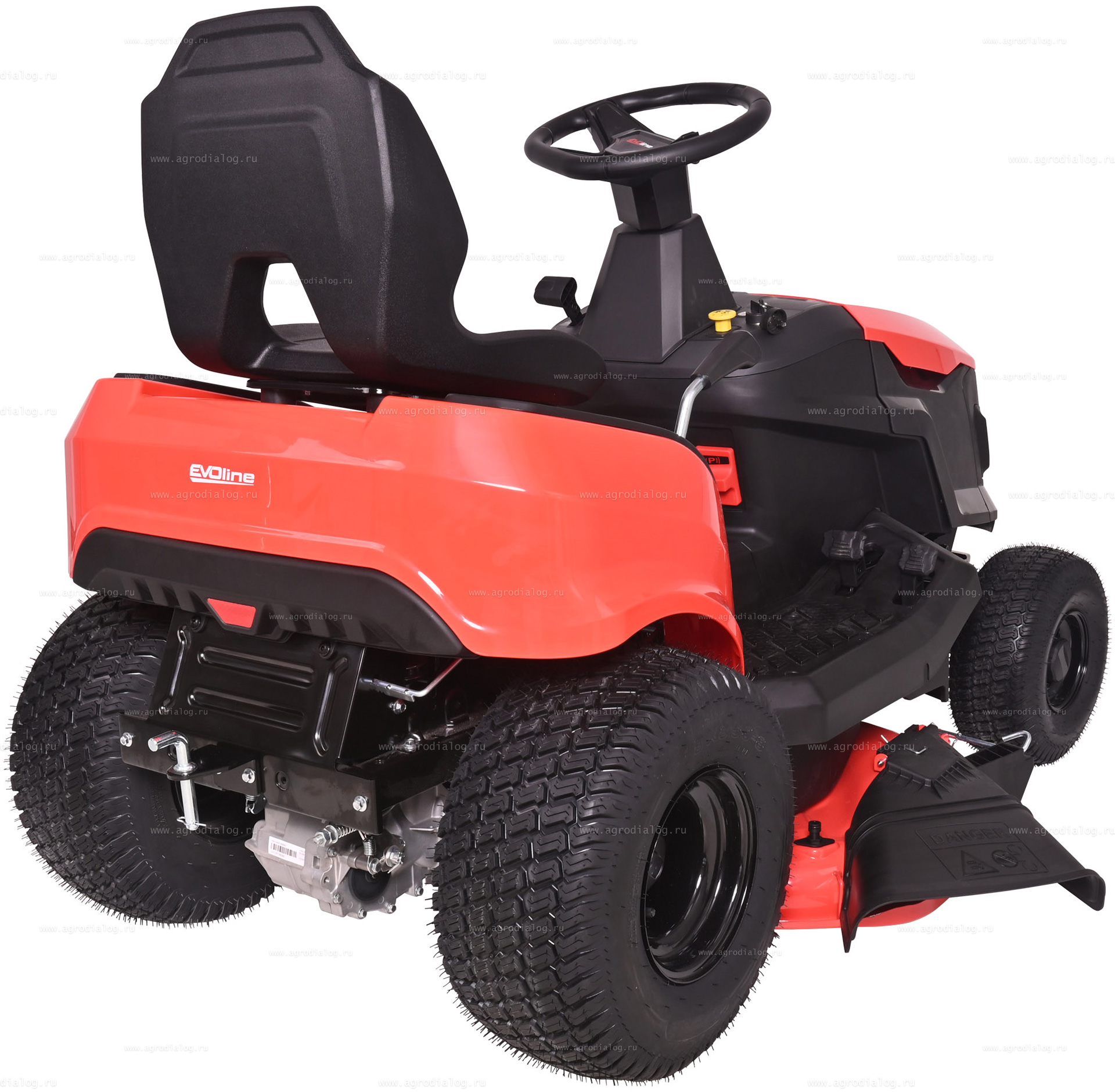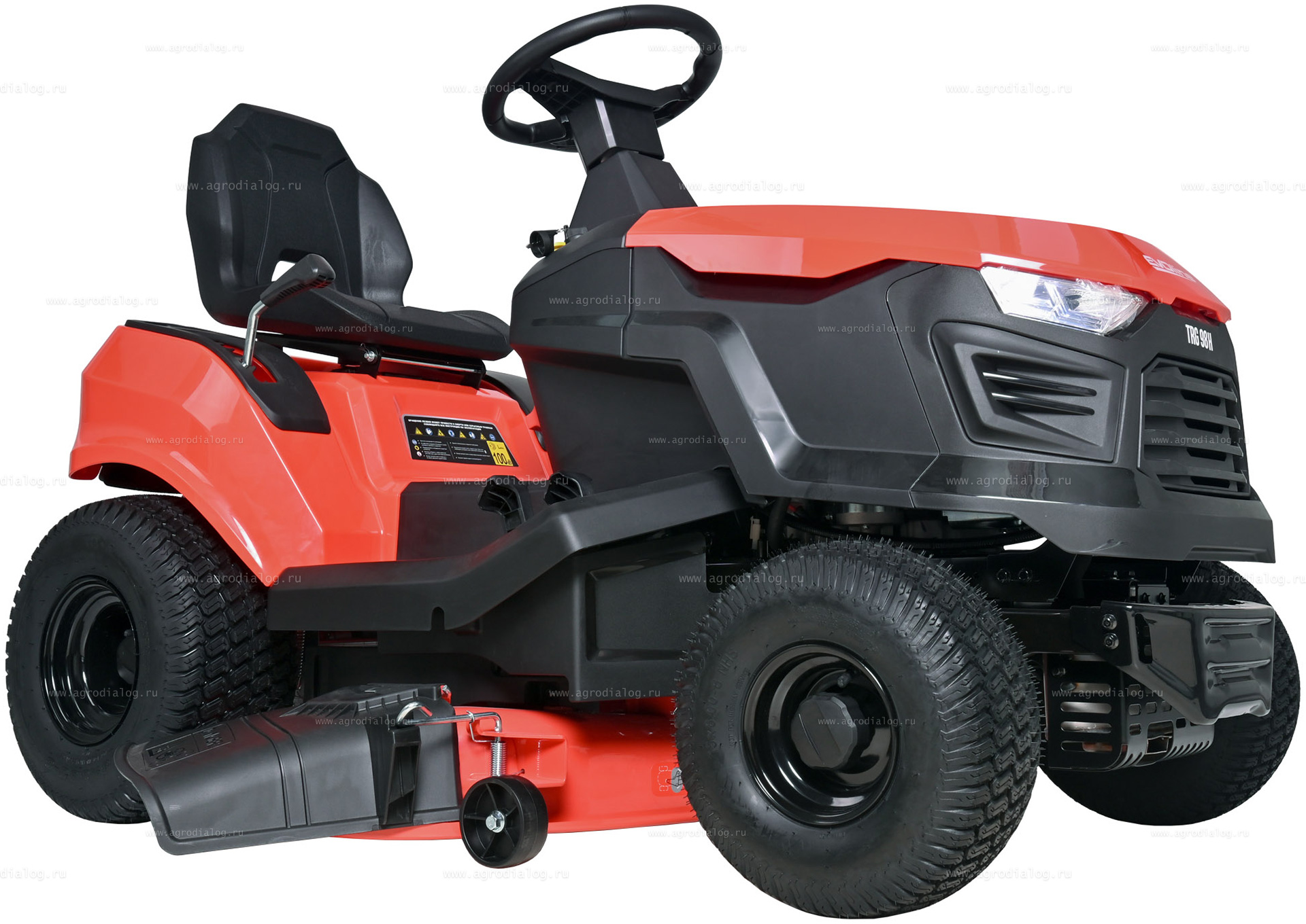 - Садовый трактор EVOline TRG 98 H оснащен системой обратного управления (СОУ) — позволяет косить при движении задним ходом. В целях безопасности необходимо убедиться, что на участке нет детей и животных.