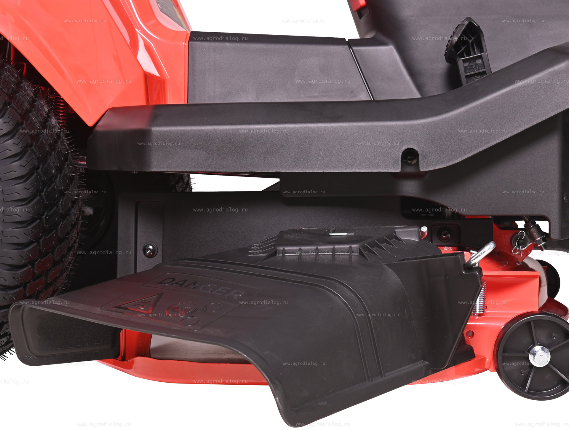 - Штуцер для подключения водяного шланга, позволяет с легкостью выполнять очистку режущей системы. Присоедините шланг к деке, включите воду, запустите двигатель, включите вращение ножей, и вы получите чистую деку. Для получения наилучших результатов производите промывку сразу после кошения.