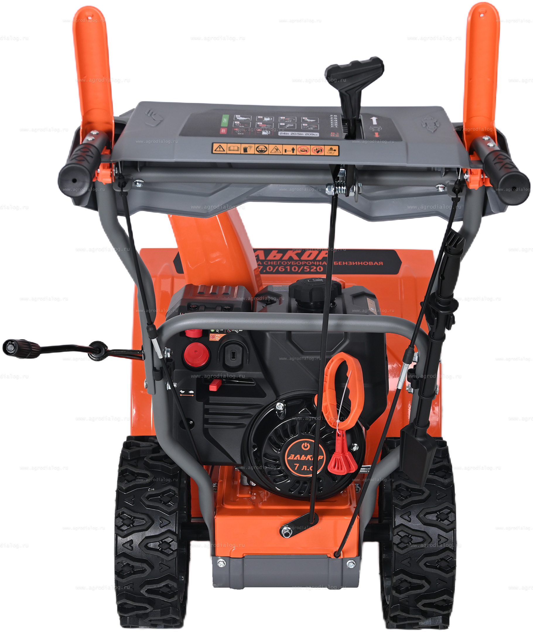 - Для передвижения по заснеженной и обледенелой поверхности бензиновый снегоуборщик АЛЬКОР МСБ-7,0-610-520 оснащён большими бескамерными колесами со специальным протектором резины.