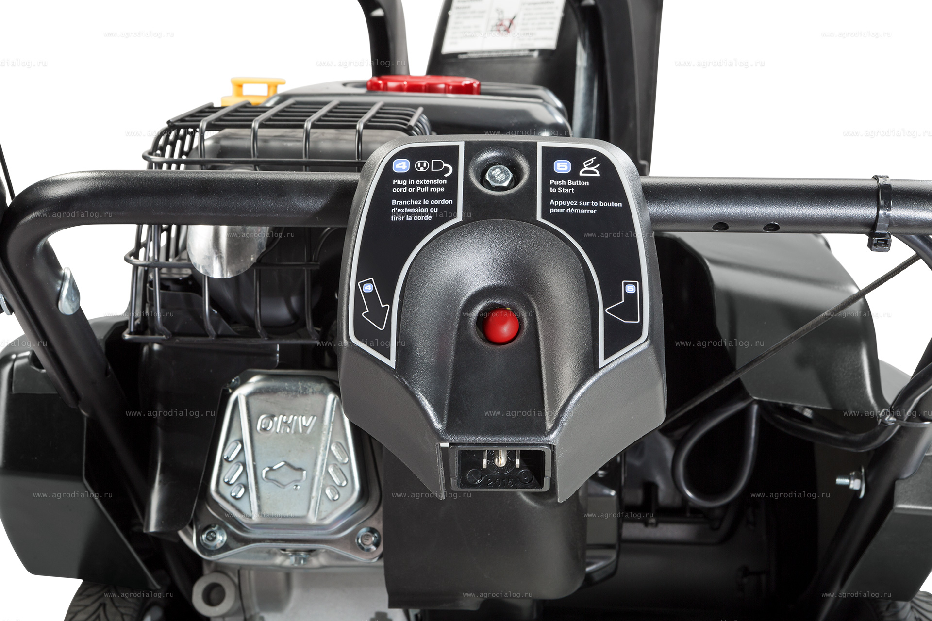 - Электрический стартер, подключаемый к стандартной электросети 220В, гарантирует легкий запуск двигателя при низких температурах до -30 °С. Не может быть ничего проще – просто подключите удлинитель к штекеру и нажмите на красную кнопку для запуска двигателя. Теплый двигатель легко заводится пусковой рукояткой.
