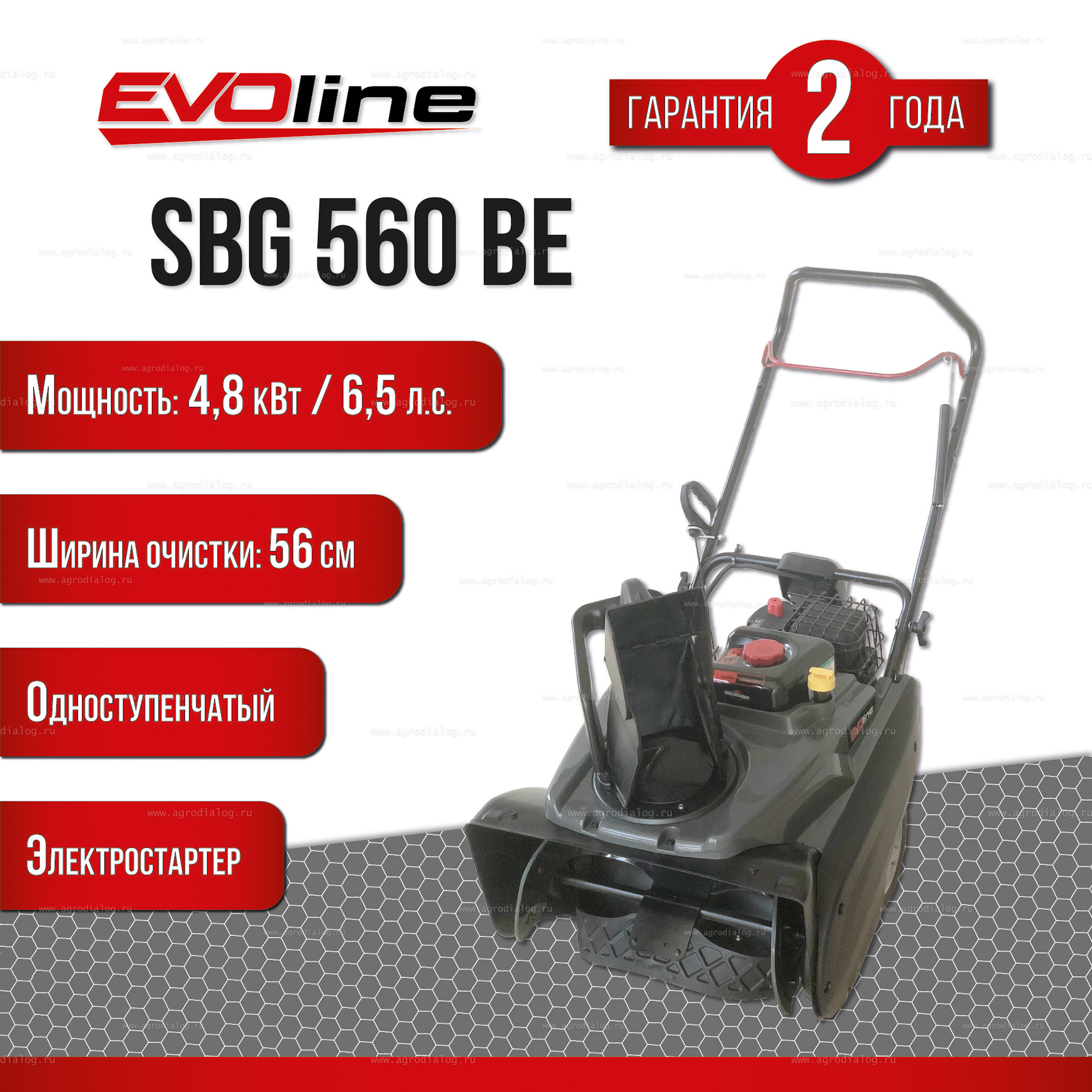 - Бензиновый снегоуборщик EVOline SBG 560 BE имеет крупные элементы управления, которыми легко оперировать даже в перчатках. Направление выброса снега удобно регулируется при помощи рукоятки. Дальность выброса снега регулируется непосредственно на дефлекторе.