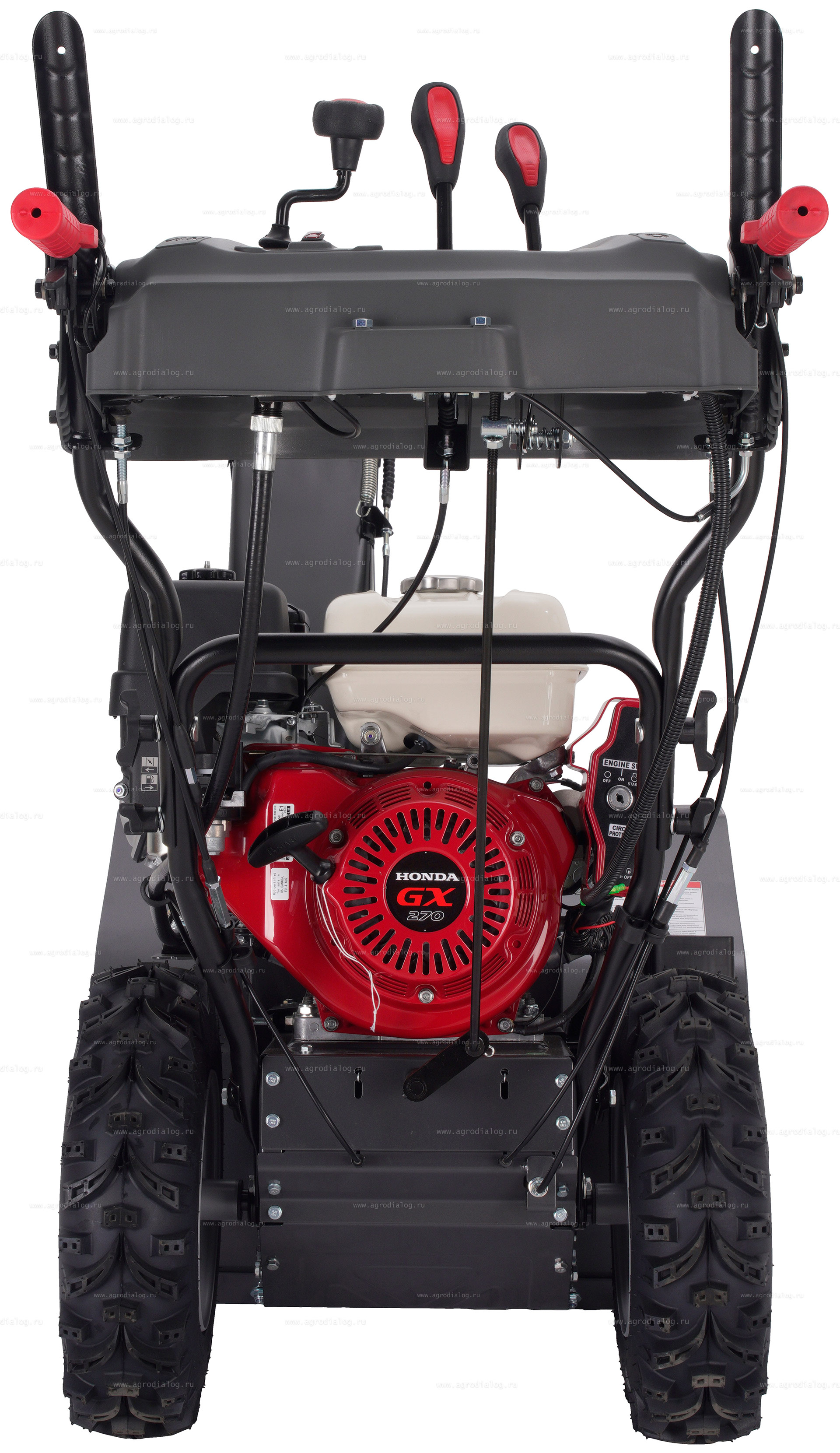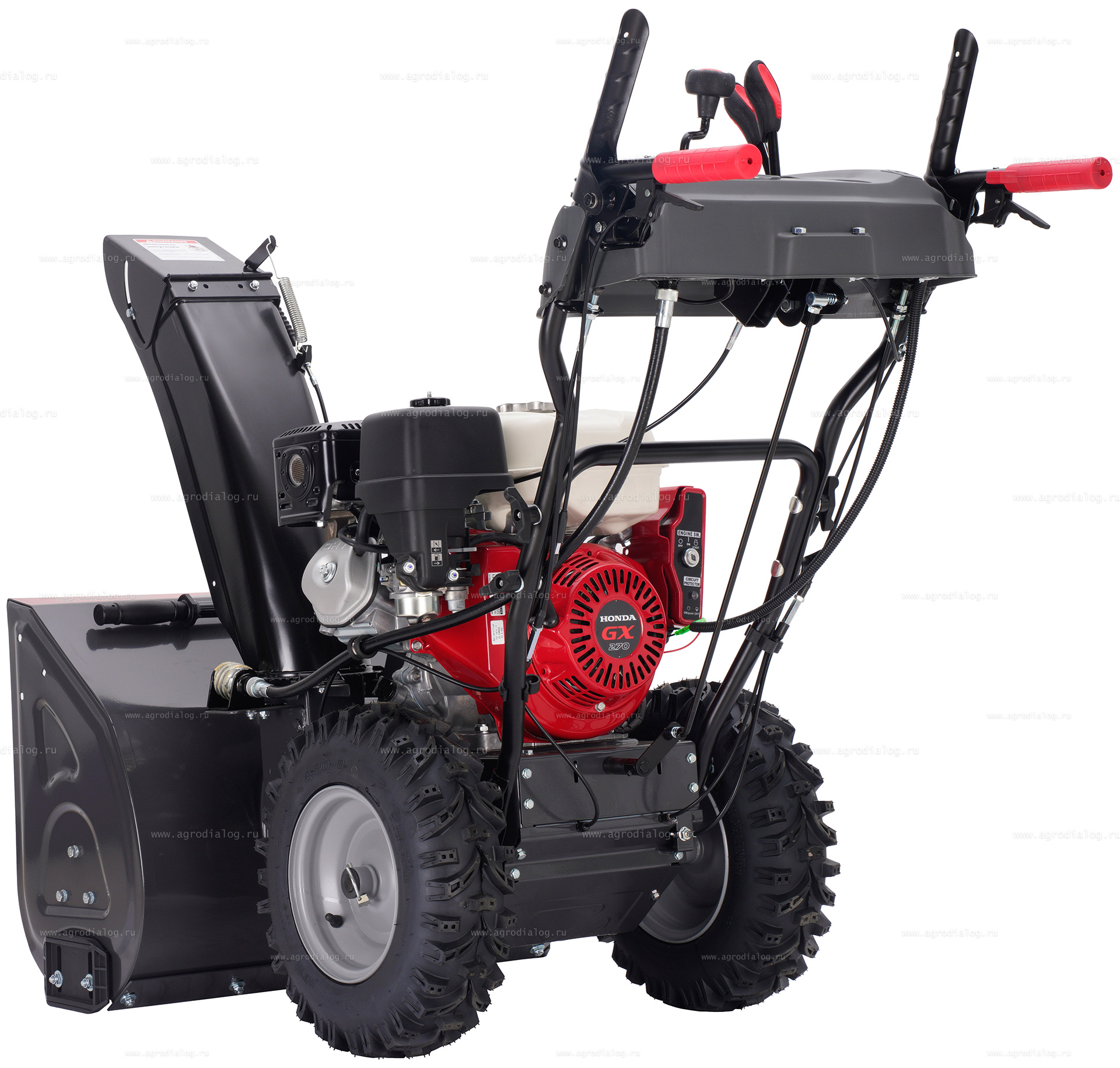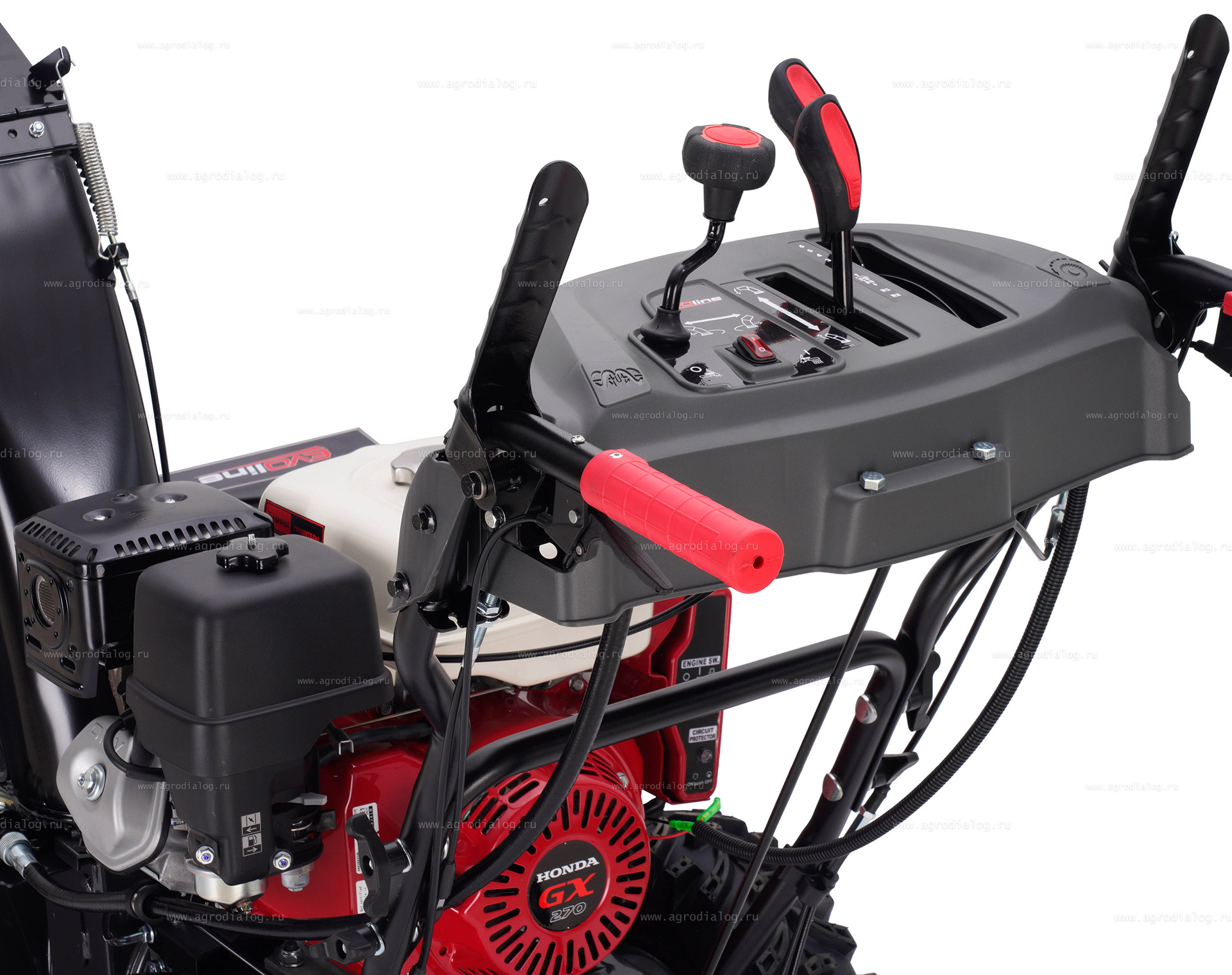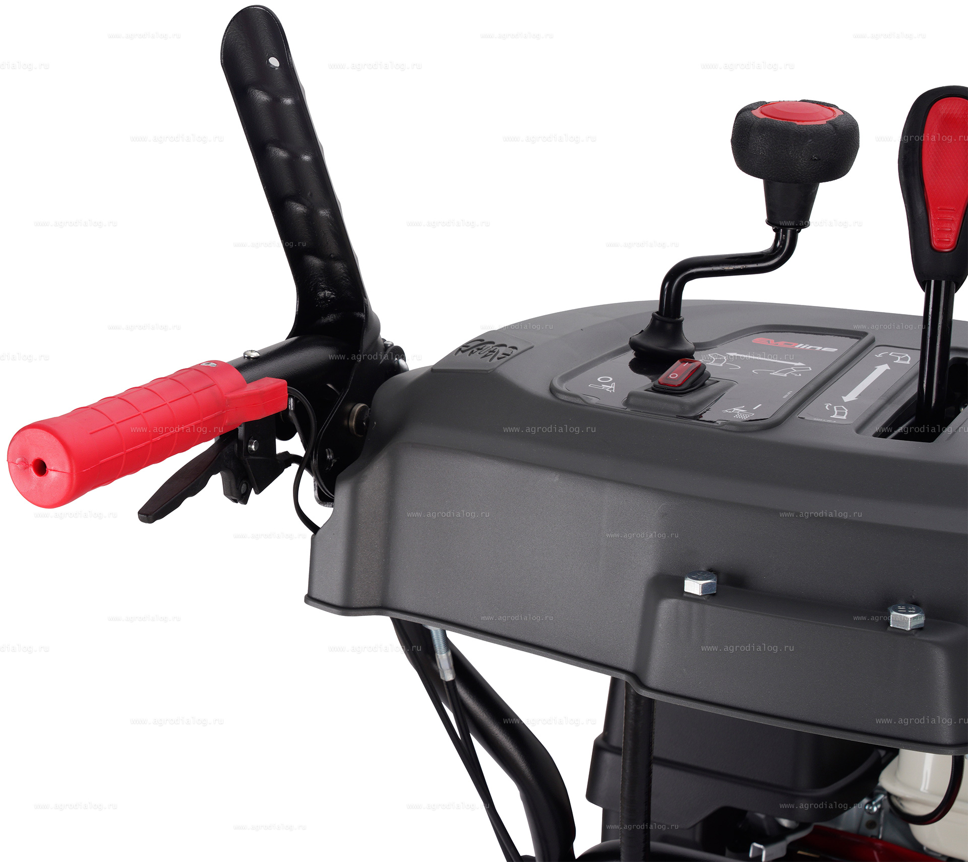 - Free hand control – блокировка ручки управления позволяет освободить одну из рук оператора, когда необходимо переключить скорость или отрегулировать направление выброса снега без остановки снегоуборщика.