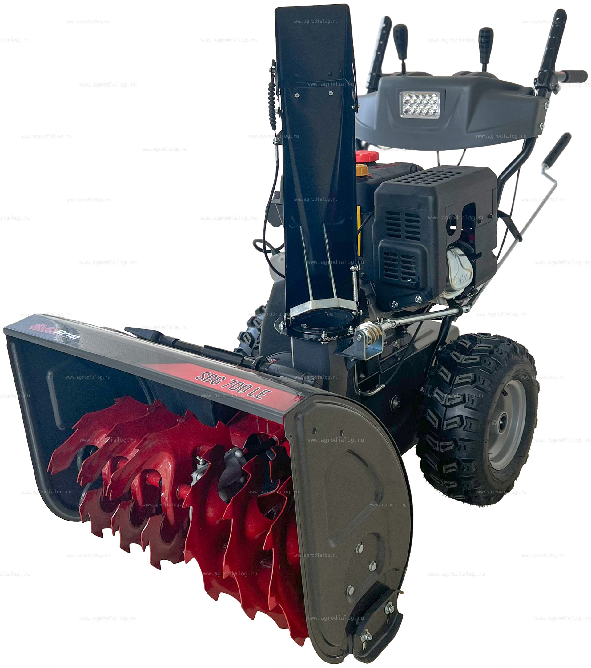 - Для удобства работы и безопасности в тёмное время суток бензиновый снегоуборщик EVOline SBG 700 LE оборудован LED фарой.