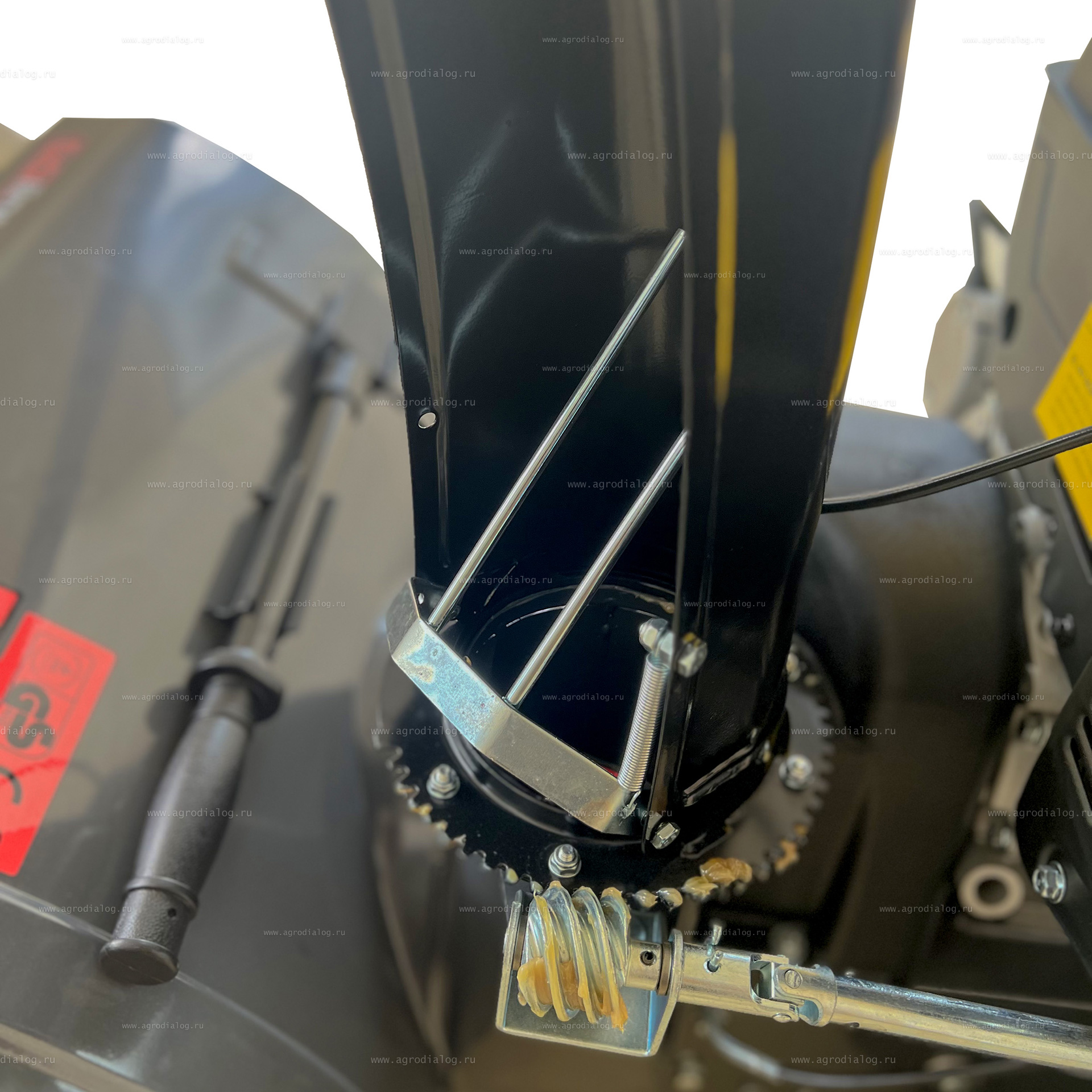 - Металлический желоб выброса с системой регулировки вращения обеспечивает возможность изменения направление отбрасывания снега при помощи операторской рукоятки управления, угол выброса регулируется при помощи удобной рукоятки расположенной на панели управления.