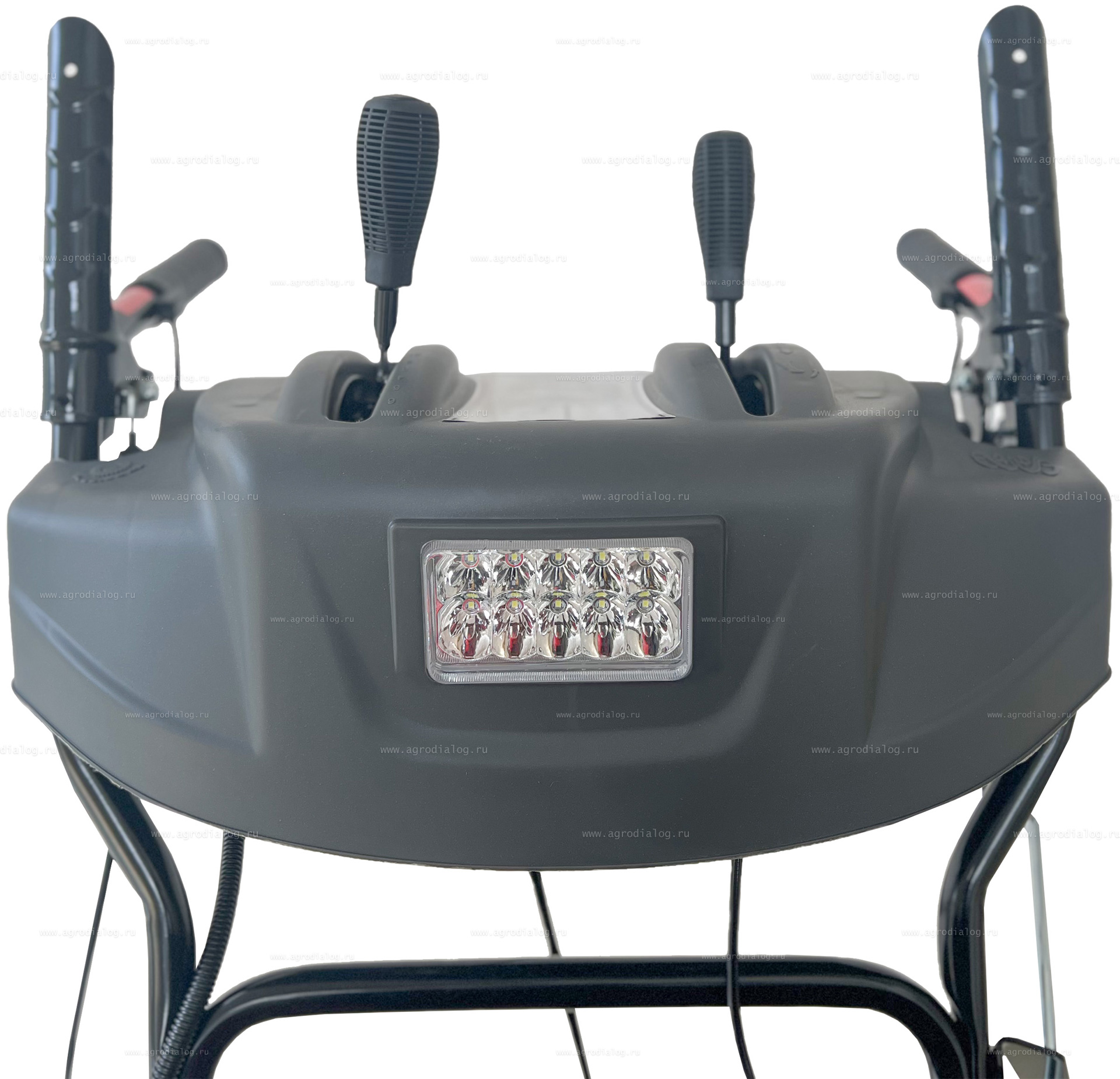 - Для удобства работы и безопасности в тёмное время суток бензиновый снегоуборщик EVOline SBG 760 LE оборудован LED фарой.