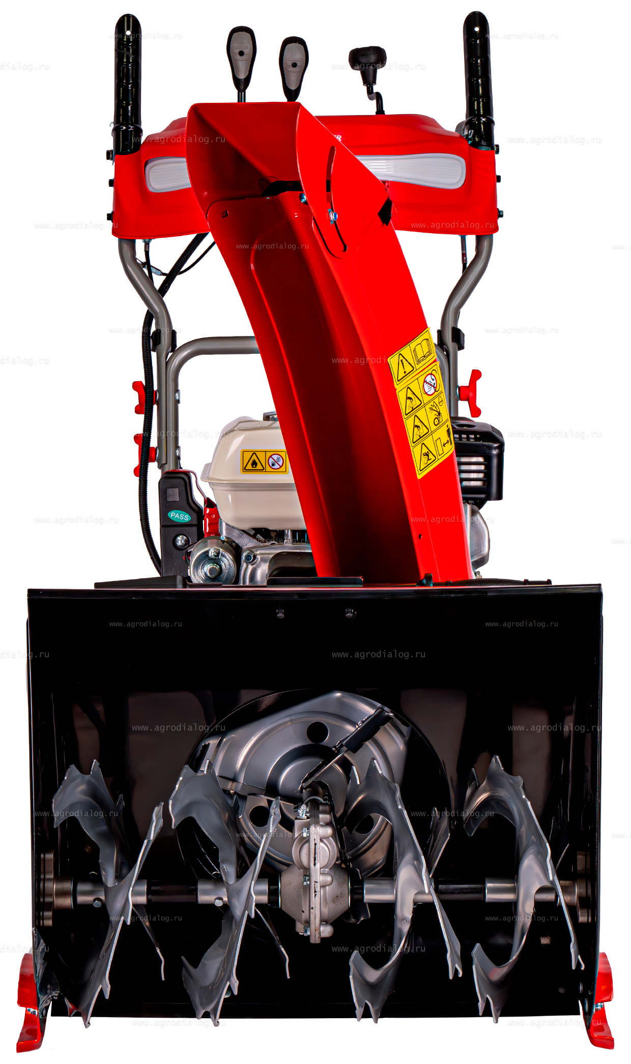 - Желоб для выброса снега изготовлен из высокопрочной легированной стали. Направление и угол выброса снега регулируется при помощи удобных рукояток, расположенных на панели управления.