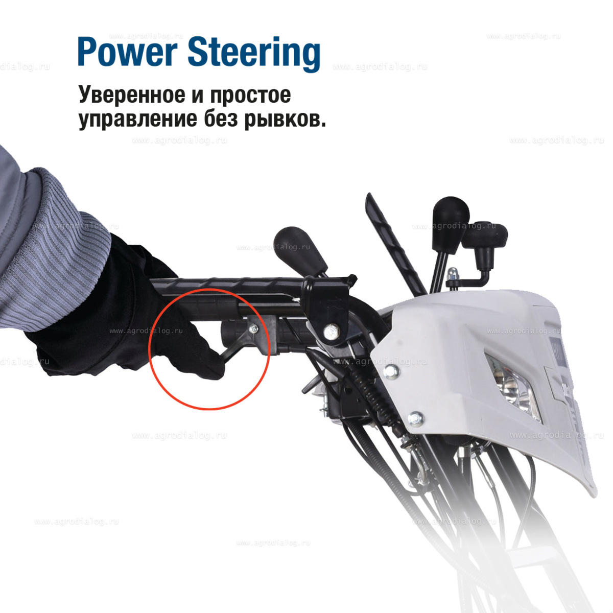 - One hand control – блокировка ручки управления позволяет освободить одну из рук оператора, когда необходимо переключить скорость или отрегулировать направление выброса снега без остановки снегоуборщика.