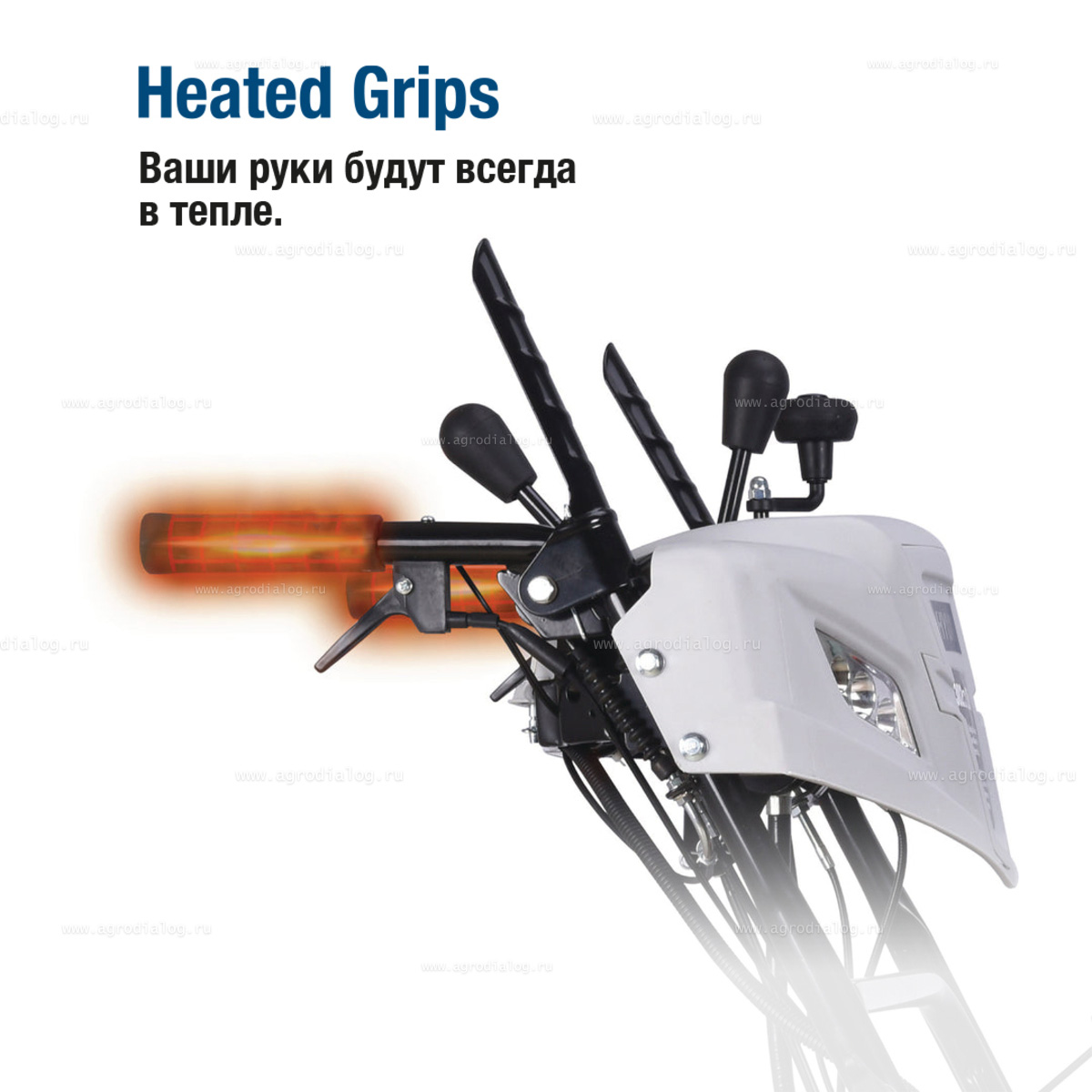 - Эргономические рукоятки управления снижают уровень вибрации и обеспечивают минимальное напряжение рук в ходе работы, встроенная система подогрева позволит работать с комфортом в холодную погоду.