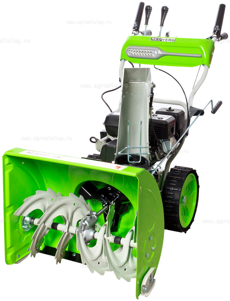 - Для удобства работы и безопасности в тёмное время суток бензиновый снегоуборщик REDVERG RD-SB62/7E оборудован светодиодной фарой.